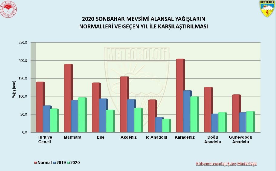 2020-2021 SU/TARIM YILI YAĞIŞLARI AZALDI2020-2021 Su-Tarım Yılı 3 Aylık Alansal Kümülatif Yağış Raporu’na göre, 1 Ekim-31 Aralık 2020 dönemini kapsayan 2021 su/tarım yılı yağışları uzun yıllar normali ve önceki yıl yağışlarının altında gerçekleştiği belirtildi. Türkiye geneli üç aylık yağış 101.1 mm, normali 195.6 mm (1981-2010) ve 2020 su/tarım yılı aynı dönem yağışı ise 153.6 mm ölçüldü. Yağışlarda normaline göre yüzde 48, 2020 yılı su/tarım yılı yağışlarına göre ise yüzde 34 azalma oldu. Tüm bölgelerde normallerine göre yüzde 35’in üzerinde azalma gerçekleşti.TÜM İLLERDE YAĞIŞ NORMALİN ALTINDA2021 su/tarım yılında il yağışlarında tüm iller normallerinin altında yağış aldı. Kütahya, Bursa, Bilecik çevreleri, İç Anadolu’nun orta ve kuzey kesimleri, Orta Karadeniz, Doğu Anadolu’nun kuzeybatısı, Van Gölü’nün kuzey ve batısı, Artvin, Ağrı, Mardin, Diyarbakır, Osmaniye, Hatay çevreleri ile Konya’nın güney kesimlerinde normallerine göre yüzde 40’tan fazla azalma gösterdi. Amasya ve Tokat çevrelerinde azalma yer yer yüzde 80’lerin üzerine çıktı. En yüksek yağış 424 mm ile Rize’de, en düşük yağış 32 mm ile Çorum’da, en fazla azalma ise yüzde 76 ile Amasya’da gerçekleşti.TÜM BÖLGELERDE YAĞIŞLAR AZALDIBölgelerde yağışlar normaline göre İç Anadolu’da yüzde 61, Karadeniz’de yüzde 51, Doğu Anadolu’da yüzde 49, Marmara ve Ege’de yüzde 46, Akdeniz’de yüzde 43, Güneydoğu Anadolu’da yüzde 37 azaldı. 2020 su/tarım yılı yağışlarına göre ise Akdeniz ve Güneydoğu Anadolu’da yüzde 47, İç Anadolu’da yüzde 46, Ege ve Doğu Anadolu’da yüzde 25’er, Karadeniz’de yüzde 21, Marmara’da ise yüzde 8 azaldı.SONBAHAR ORTALAMA YAĞIŞ 65.8 MM2020 Sonbahar Mevsimi Yağış Değerlendirmesi raporuna göre ise yağışlar hem normal hem de 2019’un altında gerçekleşti. 2020 yılı sonbaharında yurdumuz ortalama 65.8 mm yağış alırken, normali 140.6 mm (1981-2010) ve geçen yıl sonbahar yağışı 74.3 mm oldu. Yağışlar normaline göre yüzde 53, 2019’a göre yüzde 11 azaldı. En fazla azalma yüzde 59’la İç Anadolu’da oldu. Ege ve Karadeniz’de son 40 yılın en düşük yağışlı sonbaharı yaşandı.AMASYA VE TOKAT’TA YÜZDE 80’İN ÜSTÜNE ÇIKTISonbahar yağışları Adıyaman, Şanlıurfa civarları, Giresun ve Trabzon sahil kesimi, Kocaeli, Sakarya ve İstanbul’un Karadeniz kıyıları hariç tüm yurtta azaldı. Özellikle Antalya’nın doğusu, Sivas’ın batısı ve Amasya, Tokat civarlarında azalma yüzde 80’lerin üzerine çıktı. 2020 yılı sonbahar mevsiminde 81 ilin tamamı normalin altında yağış aldı. En fazla azalma yüzde 84 ile Amasya, en az yağış 21 mm ile yine Amasya’da gerçekleşti.ARALIK ALANSAL YAĞIŞ RAPORU2020 Yılı Aralık Ayı Alansal Yağış Raporu’na göre de yağışlar ülke genelinde hem normalinin hem de 2019 yılı Aralık ayı yağışlarının altında gerçekleşti. Aralık ayında 44.7 mm yağış kaydedilirken, normali 76.8 mm (1981-2010) ve 2019 yılı Aralık ayı yağışı 95.3 mm oldu. Yağışlarda normaline göre yüzde 42, 2019 yılı Aralık ayına göre yüzde 53 azalma yaşandı.ANTALYA VE İZMİR HARİÇ, TÜM İLLER NORMALİN ALTINDAAralık yağışları Afyonkarahisar, Uşak, Kütahya, Eskişehir, Bilecik, Bursa, Kastamonu ve Karabük çevreleri ile Erzurum’un kuzey kesimlerinde normallerine göre yüzde 80’in üzerinde azaldı. İzmir ve Antalya sahil kesiminde ise normaline göre yüzde 40’ın üzerinde artış kaydedildi. Aralık ayında il yağışlarında İzmir ve Antalya haricindeki tüm iller normalin altında yağış aldı. Afyonkarahisar 10.3 mm ile en az, Antalya ise 183.2 mm ile en fazla yağış kaydedilen il oldu. Normaline göre en fazla azalma yüzde 83 ile Afyonkarahisar’da meydana geldi. (DHA)İlginizi Çekebilir