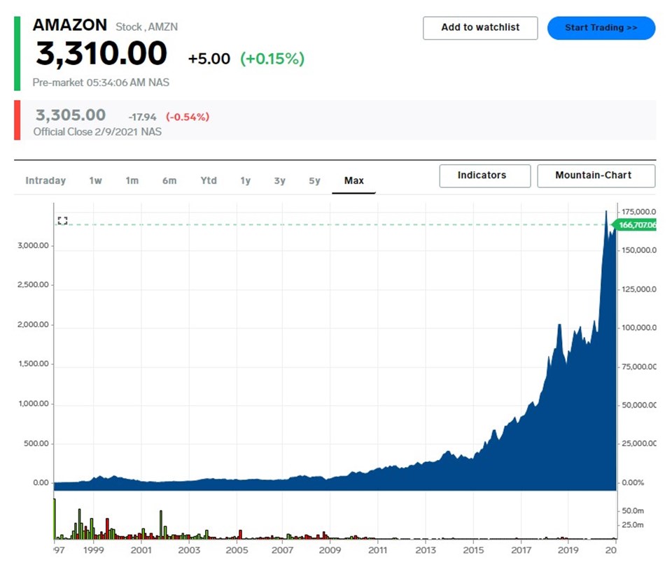 1994 yılında kurulduktan sonra 1997 yılında borsaya kote olduğunda 54 milyon dolarlık halka arz yaparak 438 milyon dolarlık bir değere ulaşan Amazon, 1999 yılında Jeff Bezos’a Time dergisi tarafından yılın kişisi unvanını kazandırdı.
