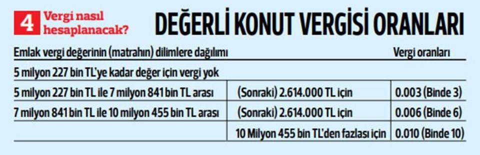 Emlak vergisi değeri 5 milyon 227 bin lirayı geçen birden fazla konutu olanlardan vergi isteniyor. Değerli konut vergisini; konutların sahipleri, varsa intifa (kullanım) hakkı sahipleri ödeyecek. Konutların emlak vergi değerleri konutun bulunduğu yerdeki belediyeden öğrenilebilir. Konuta paylı mülkiyet hâlinde sahip olanlar, hisseleri oranında mükellef kabul ediliyor. Elbirliği mülkiyette sahipleri vergiden müteselsilen (zincirleme olarak) sorumlu oluyorlar.