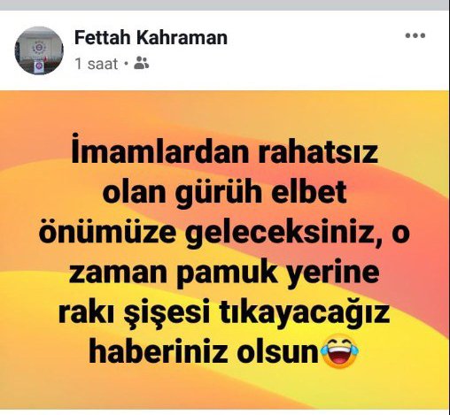 Denizli'nin cemaati en kalabalık camilerinden Bayramyeri Camisi'nin imamı Fettah Kahraman, geçtiğimiz mart ayında, gündemdeki tartışmalarla alakalı olarak facebook hesabından “İmamlardan rahatsız olan güruh! Elbet önümüze geleceksiniz. O zaman pamuk yerine, rakı şişesi tıkacağız haberiniz olsun” diye paylaşım yaptı ve sonuna da kahkaha emojisi koydu.