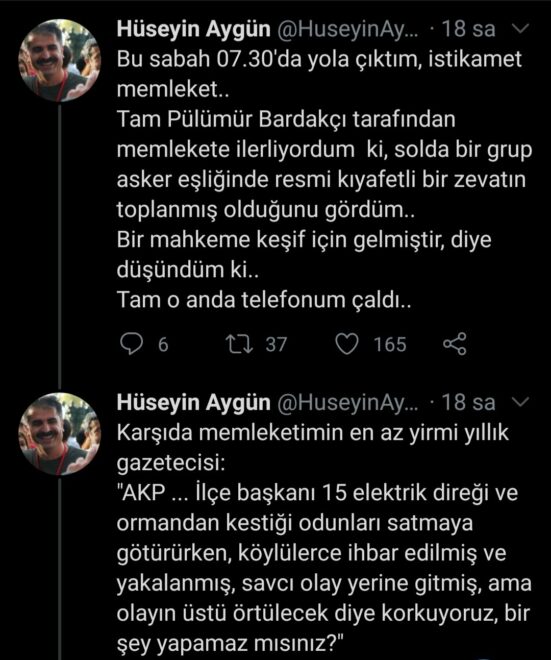 CHP'li Tunceli eski milletvekili Hüseyin Aygün, Tunceli'ye giderken karşılaştığı bir olayı sosyal medya hesabından paylaştı. Kente giderken yol kenarında bir grup asker ve adli yetkilinin bulunduğunu gören Aygün, o anda gazeteci bir arkadaşının kendisini aradığını ve AKP İlçe Başkanı'nın elektrik direklerini ve kestiği diğer odunları satmaya götürürken yakalandığını duyurduğunu söyledi.“AKP İLÇE BAŞKANI 15 ELEKTİRİK DİREĞİNİ VE KESTİĞİ ODUNLARI SATMAYA GİDERKEN İHBAR EDİLMİŞ”CHP eski Milletvekili Hüseyin Aygün'ün Twitter'dan paylaştığı olay şu şekilde: “Bu sabah 07.30’da yola çıktım, istikamet memleket… Tam Pülümür Bardakçı tarafından memlekete ilerliyordum ki, solda bir grup asker eşliğinde resmi kıyafetli bir zevatın toplanmış olduğunu gördüm. ‘Bir mahkeme keşif için gelmiştir’ diye düşündüm ki.. Tam o anda telefonum çaldı. Karşıda memleketimin en az yirmi yıllık gazetecisi: “AKP… İlçe başkanı 15 elektrik direği ve ormandan kestiği odunları satmaya götürürken, köylülerce ihbar edilmiş ve yakalanmış, savcı olay yerine gitmiş, ama olayın üstü örtülecek diye korkuyoruz, bir şey yapamaz mısınız?” Memleket o halde ki, işlenmiş bir suçu açıklamak “cesaret” işi… Ben Ankara’da yaşıyorum bir kaç senedir, gazeteci arkadaş benden bir açıklama istiyor… Herkes korku içinde. Memleket adına korkunç bir tablo değil mi? Hem Dersim adına, hem koca Türkiye..”