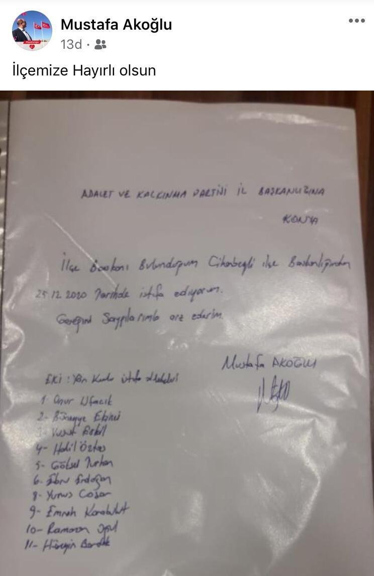 AKP'li Akoğlu, sosyal medya hesabından ‘İlçemize hayırlı olsun’ notuyla birlikte AKP Konya İl Başkanlığı'na verdiği istifa mektubunu paylaştı.Akoğlu ve yönetim kurulunda bulunan 11 kişinin istifa mektubunda “İlçe başkanı bulunduğum Cihanbeyli ilçe başkanlığından 25.12.2020 tarihinde istifa ediyorum. Gereğini saygılarımla arz ederim” ifadeleri yer aldı.GEÇTİĞİMİZ EYLÜL AYINDA BAŞKAN SEÇİLMİŞTİAkoğlu geçtiğimiz Eylül ayında gerçekleşen 7. Olağan Kongrede AKP Cihanbeyli İlçe Başkanı olmuştu.