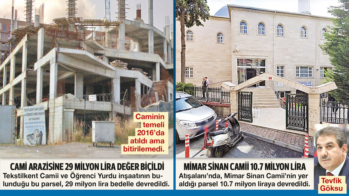 Liste incelendiğinde AKP'li Esenler Belediyesi'nin borcuna karşı devrettiği parsellerin de olduğu görüldü. Listeye göre Esenler Atışalanı'ndaki Mimar Sinan Camii'nin bulunduğu 1370 metrekarelik parsel 9 Ekim 2018 tarihinde 10 milyon 754 bin 480 TL'ye, Esenler Oruçreis Mahallesi'nde Tekstilkent Camii ve Öğrenci Yurdu inşaatının bulunduğu 3 bin 613 metrekarelik parsel 9 Ekim 2018 tarihinde 29 milyon 813 bin 190 TL'ye satıldı.