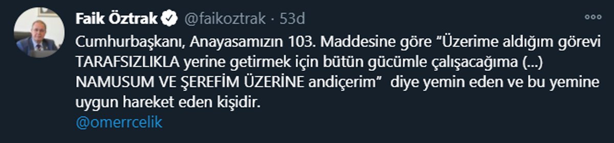 CHP Genel Başkanı Kemal Kılıçdaroğlu'nun “sözde Cumhurbaşkanı” ifadesine AKP, tepki gösterdi.Parti sözcüsü Ömer Çelik, sosyal medya hesabından yaptığı açıklamada “Kılıçdaroğlu bu sözleriyle ‘Egemenlik kayıtsız şartsız milletindir' ilkesi ile kavga etmektedir. Girdiği her seçimi kaybetmiş Kılıçdaroğlu’nun, girdiği her seçimi kazanmış Cumhurbaşkanımıza demokrasiye ve hukuka aykırı şekilde hitap etmesi ‘Yassıada zihniyeti’nin göstergesidir. Kılıçdaroğlu siyasi ahlakla bağdaşmayan bu sözleri ile milletimizin iradesine saldırmıştır. Milletimizden ve Cumhurbaşkanımızdan özür dilemelidir” dedi.ÖZTRAK’TAN AÇIKLAMAÇelik’in bu sözlerine CHP Parti Sözcüsü Faik Öztrak’tan yanıt geldi. Öztrak, Twitter hesabından Ömer Çelik’i etiketleyerek, “Cumhurbaşkanı, Anayasamızın 103. Maddesine göre ‘Üzerime aldığım görevi tarafsızlıkla yerine getirmek için bütün gücümle çalışacağıma (…) namusum ve şerefim üzerine ant içerim’ diye yemin eden ve bu yemine uygun hareket eden kişidir” ifadelerini kullandı.