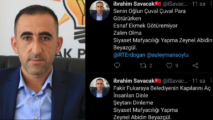 AKP Şanlıurfa İl Yönetim Kurulu Üyesi olan İbrahim Savacak sosyal medya hesabından AKP Şanlıurfa Büyükşehir Belediye Başkanı Zeynel Abidin Beyazgül hakkında ağır ifadeler kullandı.AKP'li yönetici Savacak, Şanlıurfa Büyükşehir Belediye Başkanı Zeynel Abidin Beyazgül'e, “Sen milleti Ak Parti'den küstürdün, sen milleti belediyeden küstürdün, sen milleti Recep Tayyip Erdoğan davasından soğuttun. Sen bu davaya zarar veriyorsun sen yalancısın” ifadelerini kullandı.
