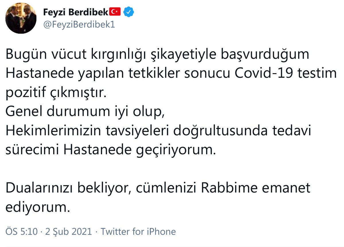 Berdibek, sosyal medya hesabından yaptığı paylaşımda şunları belirtti:* Vücut kırgınlığı şikayetiyle başvurduğum hastanede yapılan tetkikler sonucu Covid-19 testim pozitif çıkmıştır.* Genel durumum iyi olup, hekimlerimizin tavsiyeleri doğrultusunda tedavi sürecimi hastanede geçiriyorum.* Dualarınızı bekliyor, cümlenizi Rabbime emanet ediyorum. DHA