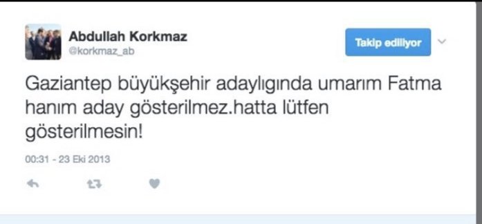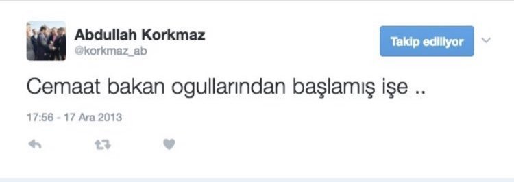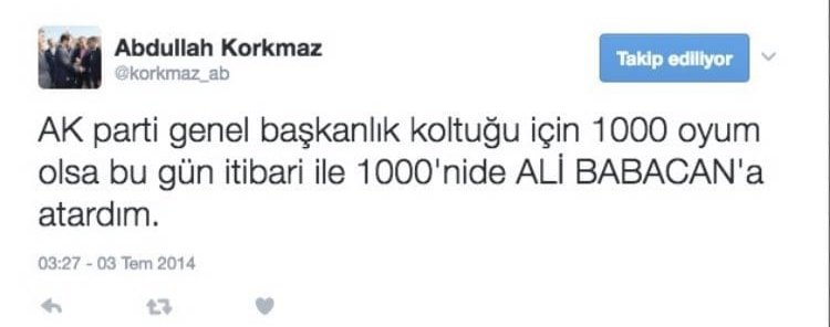 Avrasya Araştırma Merkezi Şirketi Başkanı Kemal Özkiraz, AKP Gaziantep İl Gençlik Kolları Başkanı Abdullah Korkmaz'ın 2013-2014 yılları arasındaki paylaşımlarına dikkat çekti. Korkmaz'ın 17 Aralık 2013'te “Cemaat bakan oğullarından başlamış işe” paylaşımı dikkat çekti. AKP Gaziantep il Gençlik Kolları Başkanı Abdullah Korkmaz ise, atmış olduğu bu tweet’in çarpıtıldığını savundu.“SİYASETÇİ OLUNCA BAŞ TACI EDİYORLAR”Gaziantep AKP Gençlik Kolları İl Başkanı Abdullah Korkmaz'ın tweetlerini sosyal medya hesabından paylaşan Kemal Özkiraz, “AKP Gaziantep gençlik kolları başkanıymış arkadaş memur olsa ihraç edilirdi. Tüccar olsa malına mülküne çökülürdü. Siyasetçi olunca baştacı ediliyorlar. Adamına göre muamele…” ifadelerine yer verdi.“CEMAAT BAKAN”AKP Gaziantep İl Gençlik Kolları Başkanı Abdullah Korkmaz'ın 17 Aralık 2013’te paylaştığı bir tweet’te “Cemaat bakan oğullarından başlamış işe” dediği görüldü.FATMA ŞAHİN’E KARŞI ÇIKTI, BABACAN'I ÖVDÜÖte yandan Korkmaz’ın diğer paylaşımında Ali Babacan’ı övdüğü, AKP Gaziantep Büyükşehir Belediye Başkanı Fatma Şahin’in aday gösterilmesine karşı çıktığı görüldü. Korkmaz’ın o paylaşımları ise şöyle:“AK parti başkanlık koltuğu için 1000 oyum olsa bu gün itibari ile 1000’ni de Ali Babacan’a atardım.”“Gaziantep büyükşehir adaylığında umarım Fatma hanım aday gösterilmez. Hatta lütfen gösterilmesin!”“DESTEK AMAÇLI DEĞİL KÖTÜLÜKLERİNİ ANLATAN BİR PAYLAŞIM”Atmış olduğu tweetlerle ilgili telefonla ulaştığımız Gaziantep AKP Gençlik Kolları İl Başkanı Abdullah Korkmaz, şunları söyledi:”Geçmişte atmış olduğum tweet’lerde mevcut yapıyı öven yada desteleyen bir cümlem yok. Kaldı ki o dönemde bu yapıyla ilgili olarak FETÖ diye bir tanımlama yoktu. O zamanlar herkes aynı cümleyi kuruyordu. O dönemde söylemiş olduğumuz bu kelime bu yapının destekçisi olduğumuz için değil o zaman cemaat ismi kullanılıyordu ve bende o kesimin kötülüklere başladığına dair atmış olduğum bir tweet. Kaldı ki o dönemde FETÖ diye bir yapıdan hiç kimsenin haberi yoktu. Bu tweet’im kendilerini destekleme amaçlı değil kendilerinin kötülüklerini anlatan bir paylaşımdı.”
