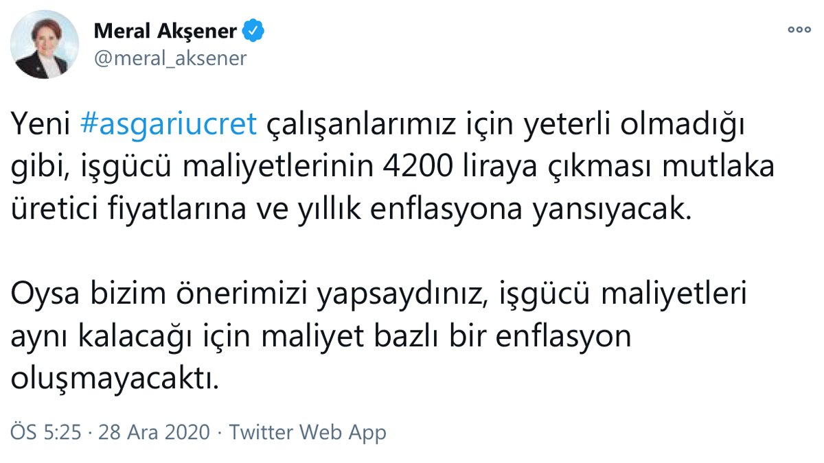 2021 yılı asgari ücretinin net 2 bin 825 lira olarak açıklanmasının ardından İYİ Parti Genel Başkanı Meral Akşener, değerlendirmesini sosyal medyadan paylaştı.“BİZİM ÖNERİMİZLE ENFLASYON OLUŞMAYACAKTI”Akşener, şu ifadeleri kullandı:* Yeni asgari ücret çalışanlarımız için yeterli olmadığı gibi, işgücü maliyetlerinin 4 bin 200 liraya çıkması mutlaka üretici fiyatlarına ve yıllık enflasyona yansıyacak.* Oysa bizim önerimizi yapsaydınız, işgücü maliyetleri aynı kalacağı için maliyet bazlı bir enflasyon oluşmayacaktı.