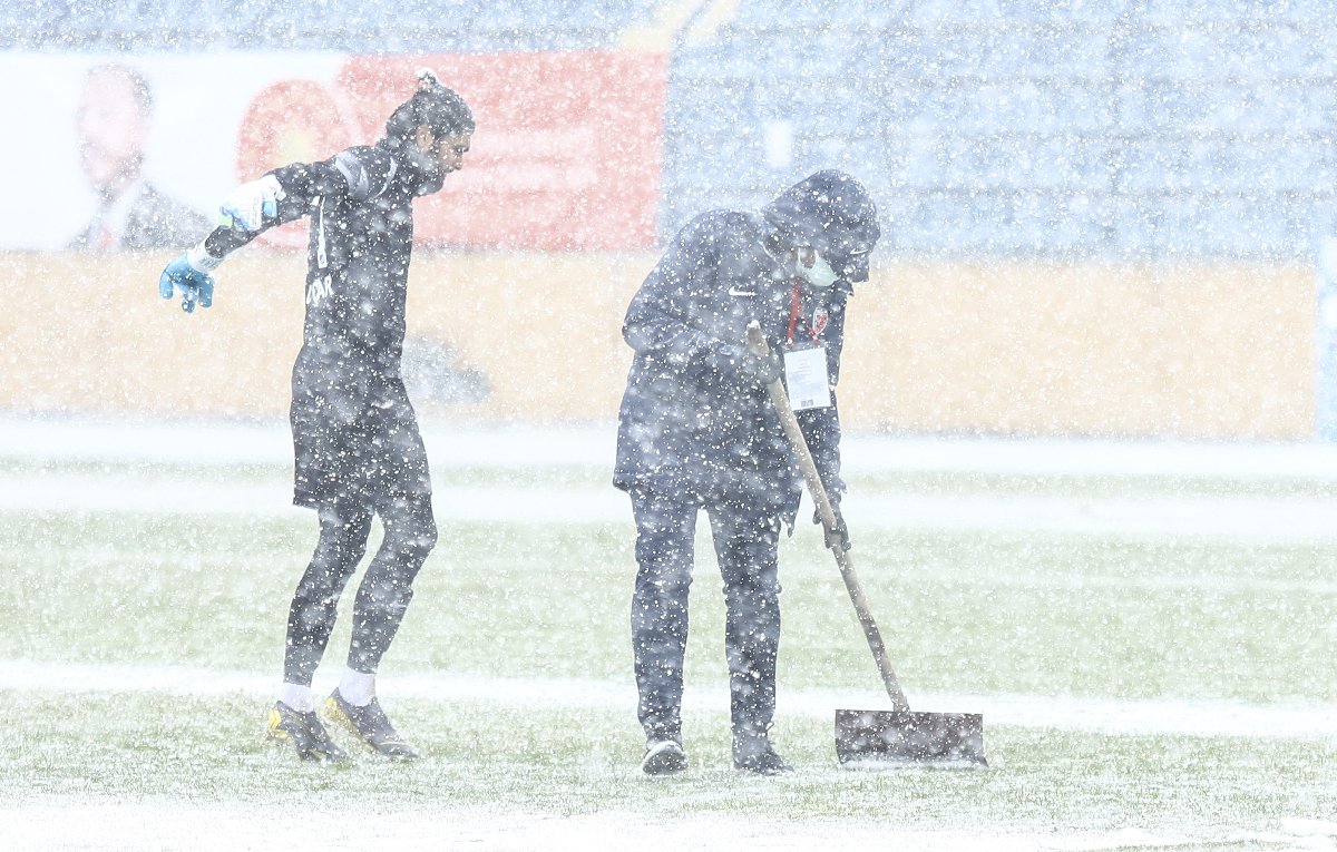 İlk yarının bitmesinin ardından saha çizgileri boyanarak belirgin hale getirildi. Yoğun kar yağışından saha görevlileri de nasibini aldı. İLGİLİ HABER