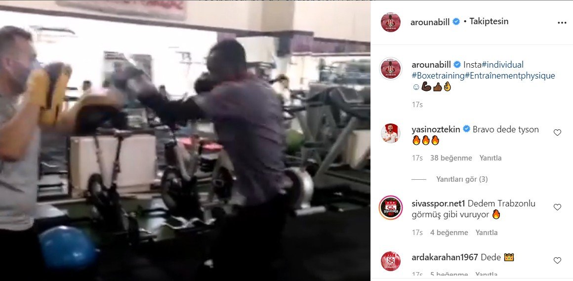 Sivasspor’un 'Dede' lakaplı 37 yaşındaki forveti Arouna Kone, sosyal medya hesabından boks yaptığı videoyu paylaştı. Paylaşılan video sosyal medyada ilgi odağı oldu. Demir Grup Sivasspor'un tecrübeli oyuncusu Arouna Kone, dün yapılan antrenman sonrası kulüp tesislerindeki fitness salonunda yumruklarını konuşturdu. Taraftarlar tarafından büyük ilgi gören Kone, boks eldivenlerini giyerek hünerlerini sergiledi. Boks yaptığı görüntülerini sosyal medya hesabından da paylaşan 37 yaşındaki deneyimli forvet, “Bireysel boks eğitimi ve fiziksel eğitim” notunu düştü.Fildişi sahilli oyuncunun sosyal medyada paylaştığı görüntüleri 5 bine yakın kişi izlerken, yüzlerce de yorum yapıldı. Sivasspor'un eski futbolcusu Yasin Öztekin de, Kone'nin videosuna, “Bravo dede Tyson” notunu ekledi.