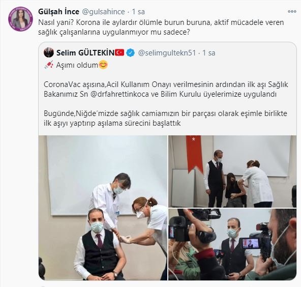 Bazı sosyal medya kullanıcıları milletvekilliği görevinde bulunduğu için eczacılık mesleğini yapamayan Selim Gültekin'in aşı yaptırmasına tepki gösterdi.– Aktif olarak vekil değil misiniz? Eczacılığı şu anda yapmadığınızı varsayıyorum. O zaman önceliğiniz nedir? Sağlık çalışanı sayısı 1 milyon 200 bin küsurlarda deniyordu, siz de bu sayıya dahil misiniz?