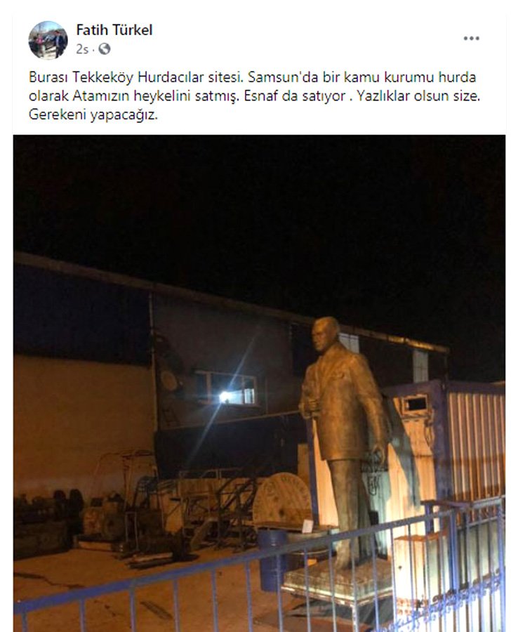 EMNİYET TAMİRE VERDİKLERİNİ AÇIKLADISamsun Emniyet Müdürlüğü ise yaptığı yazılı açıklama, “Atakum İlçesi Atatepe Mahallesi Çobanlı mevkiinde bulunan Emniyet Müdürlüğümüze ait spor salonunda tadilat, tamirat ve çevre düzenlenmesi yapıldığı sırada, spor salonunun önünde bulunan Atatürk heykelinin bakalit gövdesinde çatlaklar meydana geldiği ve demir ayaklarının paslanarak kırılmış olduğu görüldüğünden ve yerinde tamiri mümkün olmadığından Tekkeköy Sanayi sitesinde bulunan demirciye tamir ve tadilat için gönderilmiştir. Tadilat işlemi bittiğinde Atatürk heykeli eski yerine konulacaktır” denildi. Ancak, heykelin bulunduğu yerin hurdacıya ait olduğu fotoğrafla tespit edildi.ADD: SATIN ALACAĞIZAtatürkçü Düşünce Derneği Samsun Şube Başkanı Işık Özkefeli de yaptığı açıklamada, “Ulu Önderimizin büstü hepimizin bildiği gibi Tekkeköy Hurdacılar sitesinde durmaktadır. Bu heykel maalesef satıştadır ve Biz ve bir çok kişi pazarlığını yapmıştır. Almaya gideceğiz. Pazarlığı yapıldı. Şehrimizin güzel bir noktasına yerleştireceğiz. Atakum Belediye Başkanımız Sevgili Cemil Deveci de sahip çıktı. Tadilata gönderilen heykele paha biçilmez, biçildi. Keşke bir hurdacıya değil, Güzel Sanatlar Fakültesine gönderilseydi” ifadelerini kullandı.