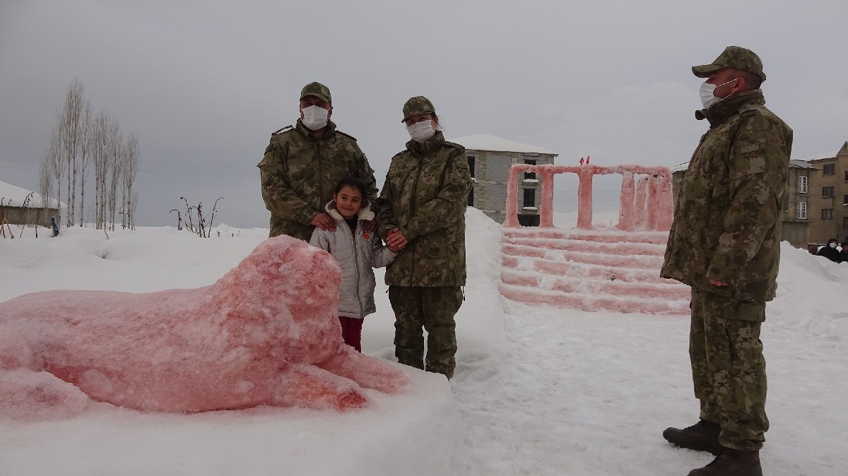 Kızım bana ‘Baba sen bize kardan helikopter, uçak ve daha değişik bir sürü figürler yaptın. Bu sefer Anıtkabir yap’ dedi. Ben de iş olmadığı için evimin bahçesinde biriken karlardan kızım Hira için Aslanlı Yol ve Anıtkabir yaptım. Güzel bir sürpriz oldu. Pandemi ve imkansızlıklar nedeniyle kızımı Anıtkabir’e götüremedim” dedi.Anıtkabir’i görmeyi çok istediğini anlatan 3’üncü sınıf öğrencisi Hira Karahan ise kuzeninin başarılı olduğu için okul tarafından Anıtkabir’e gezmeye götürüldüğünü belirterek, “Ben de benim için resim çekmesini istemiştim. Benim için çektiği resimleri görünce çok sevindim. Tek hayalim Anıtkabir’i görmek. Ancak maddi imkansızlık ve pandemi nedeniyle babam beni götüremiyor. Babam bu isteğimi kardan Aslanlı Yol ve Anıtkabir’i yaparak bana büyük bir sürpriz yaptı. Çok mutluyum bu soğuğa rağmen babam bu istediğimi gecesini gündüzünü katarak beni mutlu etti” diye konuştu.BAKAR AKAR’DAN ANKARA’YA DAVETHira’nın haberinin yayınlanmasının ardından sosyal medyadan destek mesajları gelirken, dün Yüksekova 3’üncü Piyade Tümen Komutanlığı’nda görevli komutanlar da Karahan ailesinin Yeni Mahalle’de bulunan evini ziyaret etti.Komutanlar, Milli Savunma Bakanı Hulusi Akar’ın selamını ileterek, kendilerini Ankara’ya davet ettiğini söyledi.Bu durum karşısında çok mutlu olduğunu belirten Hira ise Anıtkabir’i göreceği için çok heyecanlandığını belirterek, “Babam bana kar ve buzdan Anıtkabir yaparak sürpriz yaptı. Durum haber olunca komutan amcalar ve ablalar gelip evde ziyaret ettiler. Komutanlarımız beni çok sevdiklerini söylediler. Bakanımız bizi Ankara’ya davet etti. Anıtkabir’i göreceğim için çok heyecanlıyım, çok mutluyum ne söyleyeceğimi bilemiyorum. Bakan beye çok teşekkür ediyorum” dedi.