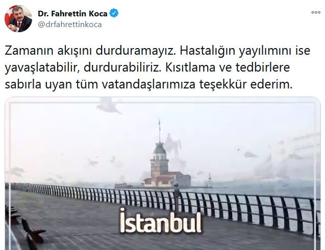 Sağlık Bakanı Fahrettin Koca, sosyal medya sitesi Twitter üzerinden yaptığı paylaşımda şu ifadeleri kullandı:* Zamanın akışını durduramayız. Hastalığın yayılımını ise yavaşlatabilir, durdurabiliriz. Kısıtlama ve tedbirlere sabırla uyan tüm vatandaşlarımıza teşekkür ederim.Bakan Koca, ayrıca paylaşımına 81 ilden boş sokakların yer aldığı bir de video ekledi. (İHA)