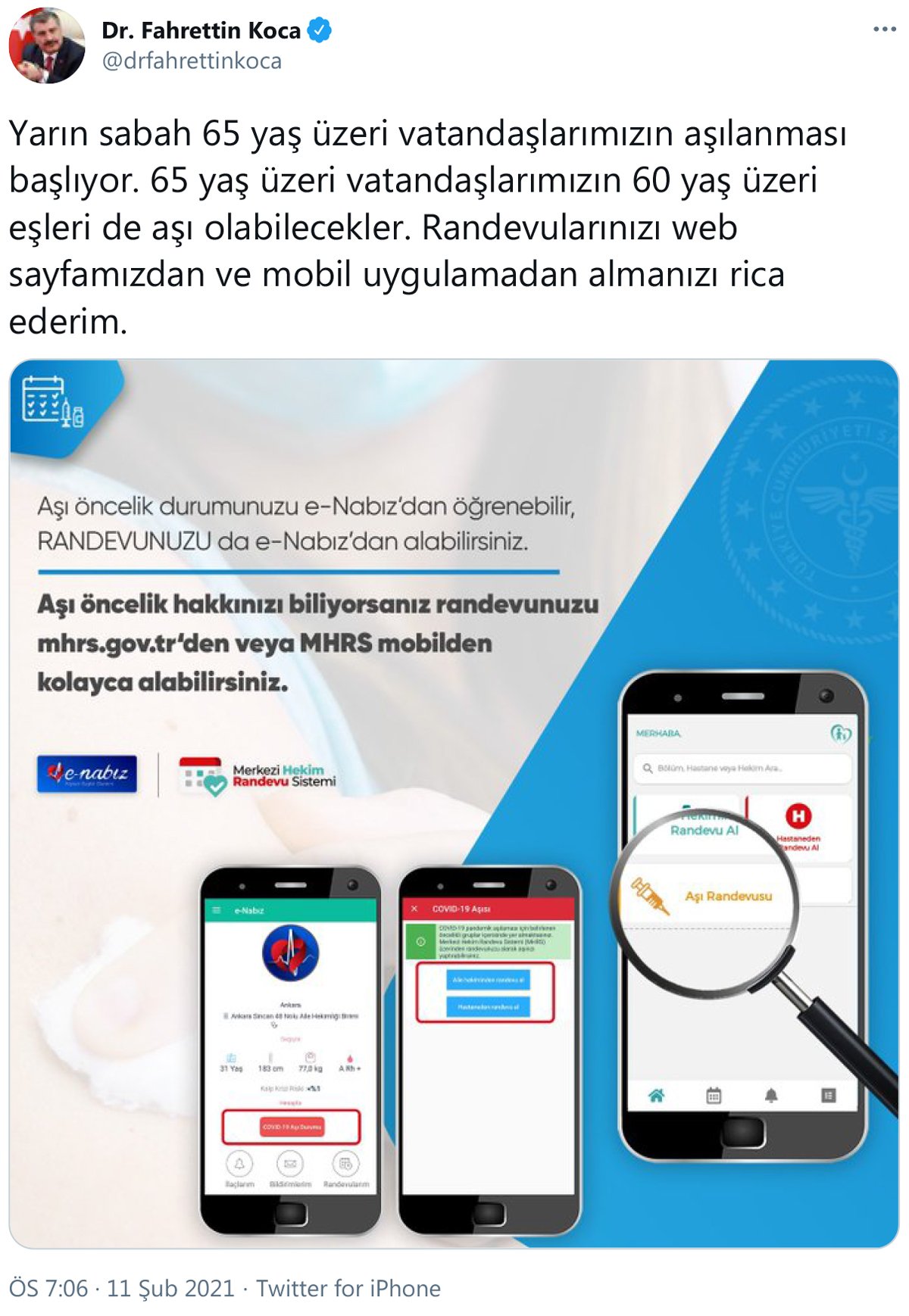 Bakan Koca, sosyal medya hesabından vatandaşlara corona virüsü aşısı yapılmasıyla ilgili açıklamada bulundu.Koca, yarın sabahtan itibaren 65 yaş üzeri vatandaşların aşılanmasına başlanacağını belirtti.65 yaş ve üzeri vatandaşların 60 yaş üzeri eşlerinin de aşı olabileceğinin bilgisini paylaşan Bakan Koca, “Randevularınızı web sayfamızdan ve mobil uygulamadan almanızı rica ederim” dedi.