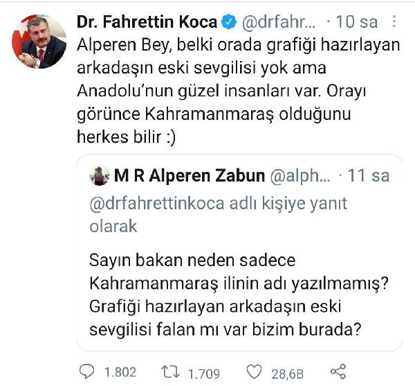 Sağlık Bakanı Fahrettin Koca, il bazında bir haftalık koronavirüs vaka sayılarını açıkladı. Bakan Koca bu açıklamayı yaparken de Türkiye haritasını kullandı, ancak haritada tüm illerin ismi yazarken, Kahramanmaraş’ın ismi yer almadı.‘ESKİ SEVGİLİSİ Mİ VAR?’Bu durum Kahramanmaraşlıların dikkatini çekti. Alper Zabun isimli kullanıcı, Bakan Koca’nın sosyal medyada paylaştığı haritanın altına, “Sayın Bakan neden sadece Kahramanmaraş ilinin adı yazılmamış? Grafiği hazırlayan arkadaşın eski sevgilisi falan mı var bizim burada?” diye yazdı.‘KAHRAMANMARAŞ OLDUĞUNU HERKES BİLİR’Alperen Zabun’un bu sorusuna Sağlık Bakanı Fahrettin Koca kayıtsız kalmadı ve sosyal medya hesabından, “Alperen Bey, belki orada grafiği hazırlayan arkadaşın eski sevgilisi yok ama Anadolu'nun güzel insanları var. Orayı görünce Kahramanmaraş olduğunu herkes bilir :)” şeklinde yanıt verdi.Koca’nın esprili soruya espri ile verdiği cevabı binin üzerinde retweet aldı. Alper Zabun da bu cevap üzerine Bakan Koca ve grafiği hazırlayan kişiyi Kahramanmaraş’a dondurma ve tatlı yemeye davet etti. (DHA)