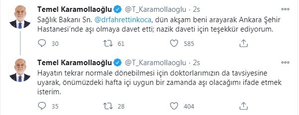 Saadet Partisi Genel Başkanı Temel Karamollaoğlu, sosyal medya hesabından paylaşım yaparak gelecek hafta içi uygun bir zamanda aşı olacağını duyurdu.Karamollaoğlu, paylaşımında şu ifadeleri kullandı* Sağlık Bakanı Sn. @drfahrettinkoca, dün akşam beni arayarak Ankara Şehir Hastanesi'nde aşı olmaya davet etti; nazik daveti için teşekkür ediyorum.* Hayatın tekrar normale dönebilmesi için doktorlarımızın da tavsiyesine uyarak, önümüzdeki hafta içi uygun bir zamanda aşı olacağımı ifade etmek isterim.