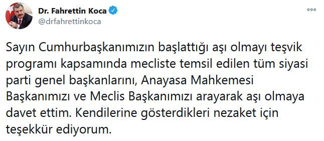 Sosyal medya hesabından açıklamalarda bulunan Sağlık Bakanı Fahrettin Koca şu ifadeleri kullandı:* Sayın Cumhurbaşkanımızın başlattığı aşı olmayı teşvik programı kapsamında mecliste temsil edilen tüm siyasi parti genel başkanlarını, Anayasa Mahkemesi Başkanımızı ve Meclis Başkanımızı arayarak aşı olmaya davet ettim. Kendilerine gösterdikleri nezaket için teşekkür ediyorum.