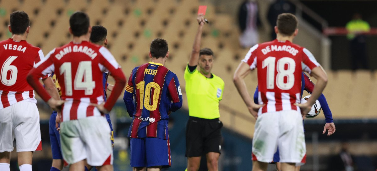 İspanya Süper Kupa finalinde Athletic Bilbao'ya uzatmalar sonucunda 3-2 kaybeden Barcelona, yıldız futbolcu Lionel Messi'yi de kaybetti. Tecrübeli isim, Katalan ekibindeki kariyerinde ilk kez kırmızı kart gördü. İspanya Süper Kupa finalinde Athletic Bilbao’ya 3-2 yenilen Barcelona, kupayı müzesine götürmeyi başaramazken Lionel Messi de gördüğü kırmızı kartla takımını yalnız bıraktı. Karşılaşmanın bitmesine saniyeler kala, Athletic Bilbao forveti Asier Villalibre’nin kendisine yaptığı şarja sinirlenen Arjantinli yıldız, rakibine arkadan vurdu. Hakem Gil Manzano pozisyonu gözünden kaçırdı ancak VAR uyarısıyla yaşananları ekrandan izledi ve Messi’ye doğrudan kırmızı kartını verdi. Barcelona formasıyla 753. maçına çıkan Arjantinli yıldız, Katalan ekibindeki kariyerinde ilk kırmızı kartını gördü. İspanya federasyonunun yıldız oyuncuya en az 4 maç ceza vermesi bekleniyor. Bu nedenle Messi’nin Copa del Rey’deki Cornella ve La Liga’da oynanacak Elche, Athletic Bilbao ve Real Betis maçlarını kaçıracağı öğrenildi. La Liga’da üçüncü sırada yer alan Barcelona, iki maçı eksik olan lider Atletico Madrid’in 7 puan gerisinde bulunuyor.