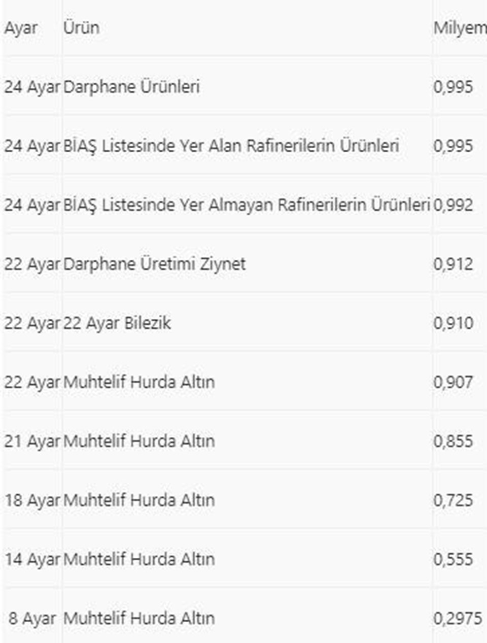 Milyem değeri, altın saflığının 1.000 üzerinden değerlendirmesi olarak açıklanıyor. Bu değerin hesaplanabilmesi için altından yapılan maddenin içerisinde bulunan saf altın kütlesi, toplam kütleye bölünerek 1.000 ile çarpılıyor.Yönetmelikte yapılan değişiklikle bankaların topladıkları fiziki altınlar için ayar ve ürün bazında belirlenen milyem değerleri şöyle: