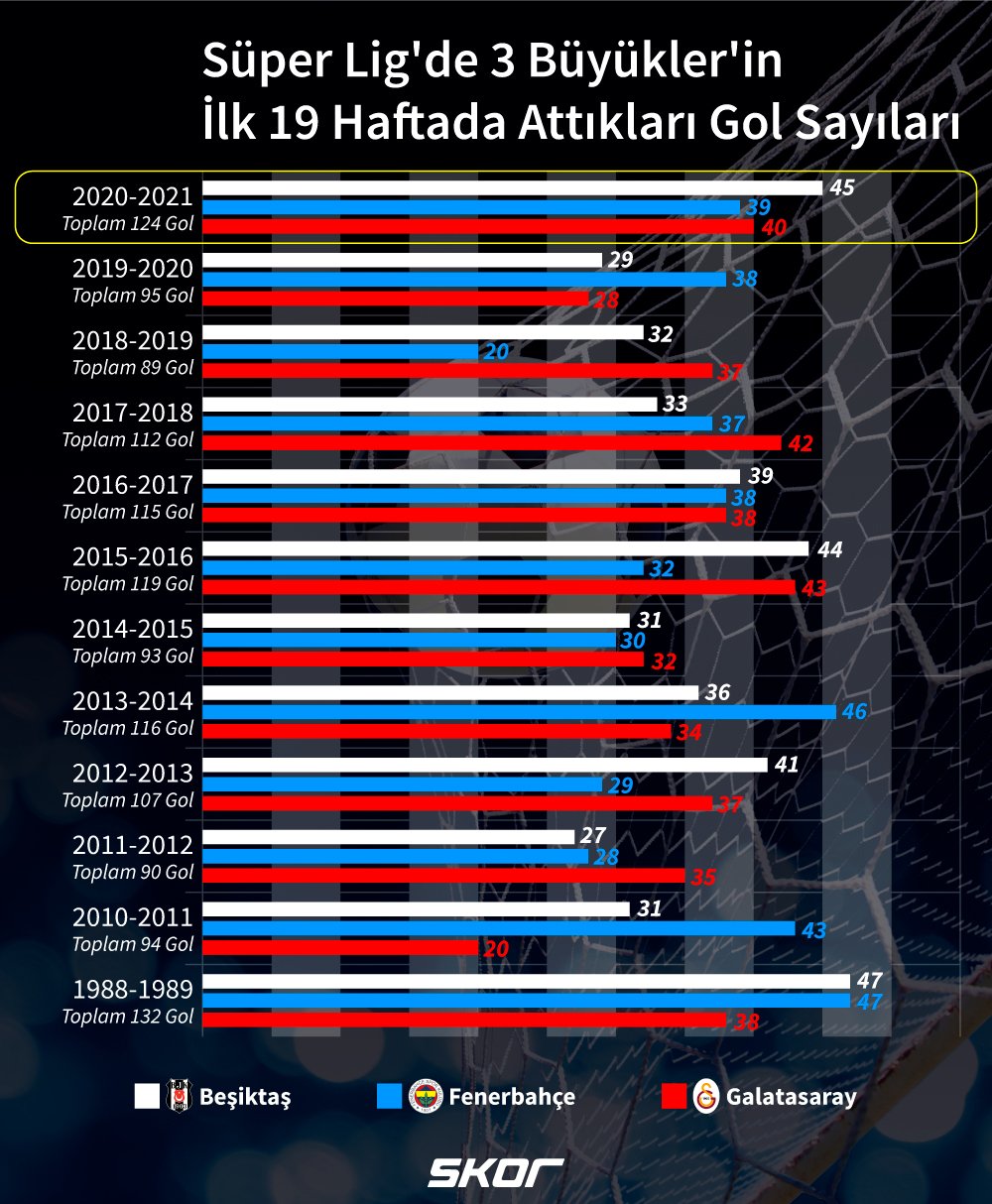 Üç Büyükler, Süper Lig'in ilk 19 maçlık periyodundan gol rekoru kırarak çıktı. Genel gol ortalamasından ayrı olarak Beşiktaş, Fenerbahçe ve Galatasaray, rakiplerine nazaran fark yaratırken pandeminin muhtemel etkisi de gündeme geldi. Peki rekoru getiren faktörler ne oldu? Hayatın her alanına etki eden ve kendi normallerini yaratan Covid-19, futbol üzerinde de ciddi etkiler yaratmış durumda. Taraftarsızlık başlı başına büyük bir problem ve bu problem kendisini futbol ekonomisi alanında da net bir şekilde gösteriyor. Covid’in saha içi etkilerine de değinmek gerek. Ertelenen organizasyonlar nedeniyle fikstürde yaşanan sıkışma kadro derinliğine sahip takımların fark yaratmasına, seyircisiz oynanan maçlar ise zaman zaman saha içinde takımların senaryolara göre konsantrasyon problemi yaşamasına neden oluyor. Ortaya çıkan bazı absürd denebilecek sonuçlar ve bu sonuçların pandemi sürecinde daha rastlanır hale gelmesi bu maç içi kopmaların net bir göstergesi olarak öne çıkmakta. Peki bu durum skorları ve atılan golleri nasıl etkiledi? Avrupa’nın beş büyük liginin ve Süper Lig’in son 5 senesine baktığımızda gol ortalamalarında dikkate değer bir değişim yok. Tüm liglerin az da yükseldiği veya düştüğü gibi ortak bir trende de rastlanmıyor. Ancak gözümüzü Türkiye’ye çevirince ve biraz dikkatli bakınca çarpıcı bir durum gözler önüne seriliyor. O da Üç Büyükler’in yarattığı fark.