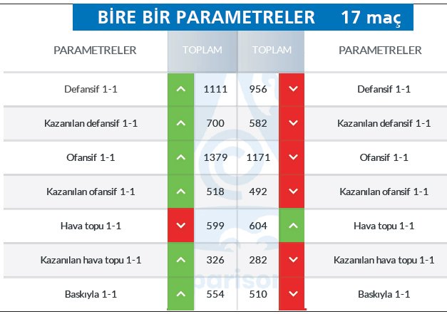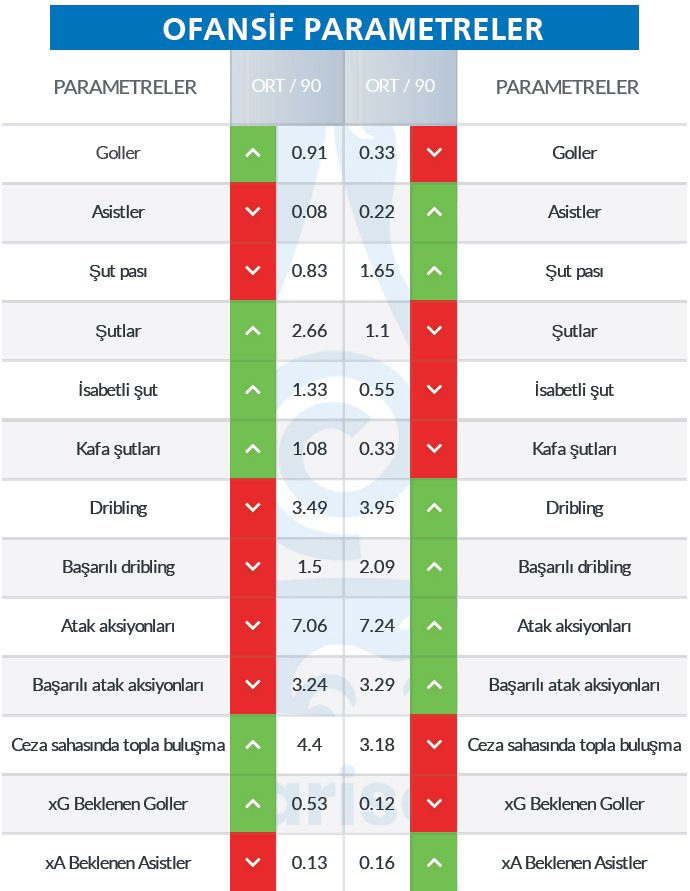 Atılan goller ve asistlerde Beşiktaş'ın ortalamalarda önde olduğunu görsek de şut paslarında ve isabetli şutlarda Galatasaray'ın üstünlüğü dikkat çekiyor. Yani bu alanda eşitlik var. Başarılı atak aksiyonları ve ceza sahasında topla buluşmada -ki bu iki parametre galibiyette en önemli ikincil parametreler kuşağındadır- Galatasaray önde. Fakat ‘dribling' ve ‘başarılı dribling'lerde Beşiktaş'ın varlığını daha çok hissediyorsunuz. Üzerine Beşiktaş'ın kafa şutları Galatasaray'a oranla daha fazla. Yani top eğer hücum oyuncularının kafasına gelirse ortalardan gol bulma ihtimali yüksek.