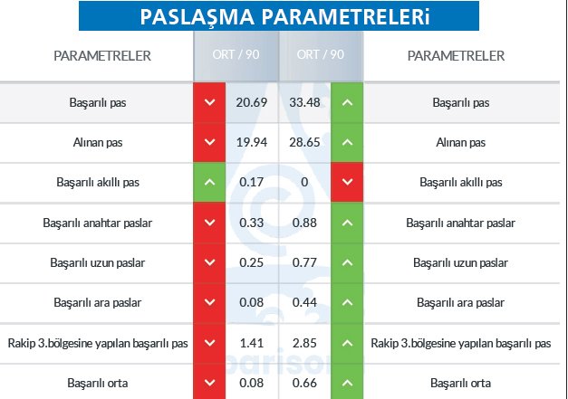 Neredeyse tüm yaratıcı paslaşma stratejileri Galatasaray lehine gözüküyor. Anahtar paslar, ara paslar, akıllı ve uzun paslar Galatasaray üstünlüğünde. Buna yüksek oranda orta ve isabetli orta oranları da katılınca bu bölümün yüzde 70 hâkimiyeti sarı-kırmızılılarda. Beşiktaş, hızlı oyun taktiği ile genelde kontrataklarla tehlikeli olabilen bir takım. ‘Rakip 3. bölgesine başarılı paslar'da önde. Bu da Beşiktaş'ın önemli bir avantajı.
