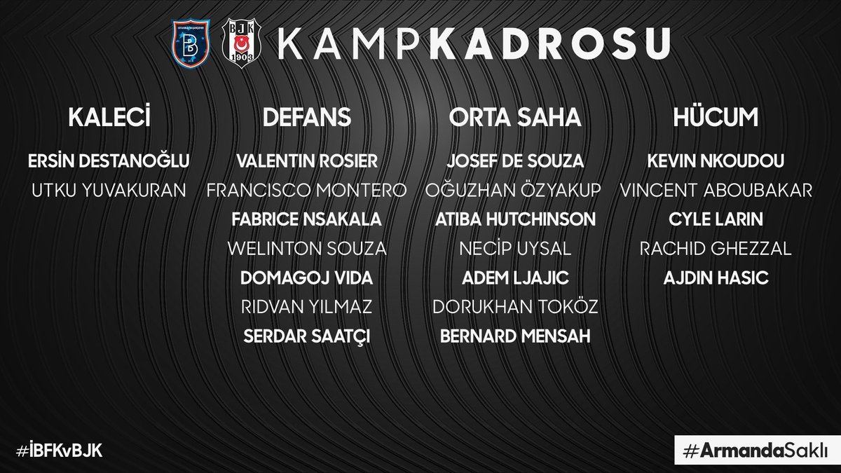 Teknik direktör Sergen Yalçın'ın yedek kulübesinde olmayacağı Başakşehir maçı öncesinde Beşiktaş'ın kamp kadrosu açıklandı. Süper Lig’in 30. haftasında Başakşehir ile deplasmanda karşılaşacak olan lider Beşiktaş’ta maç kadrosu belli oldu.Teknik direktör Sergen Yalçın’ın 4 sarı kart görmesi nedeniyle tribünden takip edeceği karşılaşma için Cenk Tosun ve Gökhan Töre kadroya dahil edilmedi.Sakatlanan Gökhan’ın yanı sıra Salı günü takımdan ayrı çalışmalara başlayan Cenk de takımını yalnız bırakacak. Cenk Tosun 15 Şubat’ta oynanan ve 2 gol attığı Gençlerbirliği maçından bu yana takımdan ayrı!Beşiktaş’ın Cuma günü 19.00’da oynayacağı Başakşehir maçta Necip Uysal, Rosier, Josef ve Ghezzal sarı kart görmeleri halinde 21 Mart Pazar günü oynanacak Fenerbahçe derbisinde forma giyemeyecek.