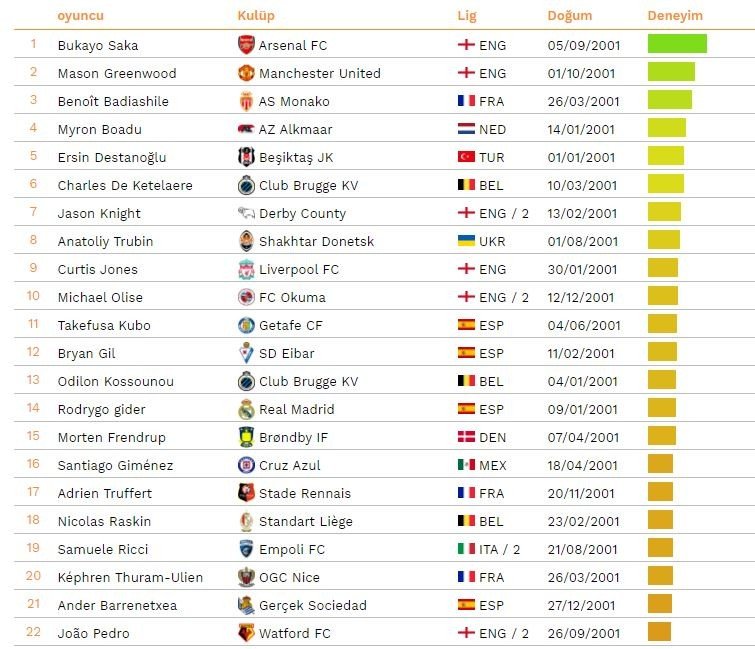 Beşiktaş'ın 20 yaşındaki kalecisi Ersin Destanoğlu, yayımlanan listedeki tek Türk oyuncu oldu. Bu sezon 22'si Süper Lig olmak üzere 24 kez siyah-beyazlıların kalesini koruyan Ersin, bu mücadelelerde 22 gol yedi. Genç yıldız 10 mücadelede de kalesini gole kapadı.