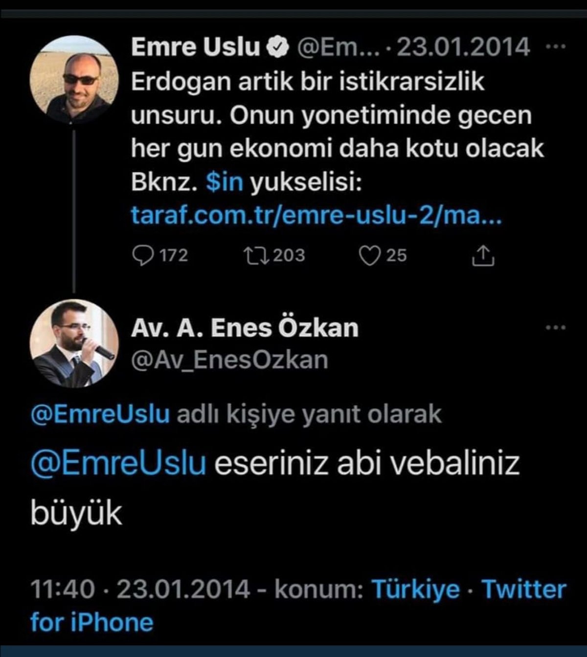 Firari FETÖ'cü Emre Uslu'nun, “Çal-dı-lar. Çalana kızmıyorsunuz ama çaldıklarını söyleyene kızıyoruz. Çünkü çalanın çaldığını biliyor, erketelik yapıyordunuz” diye yaptığı paylaşıma Özkan, şu yanıtı veriyor: “Emre abi bozuk plak gibi ağzında sana bu tür habercilik yakışmıyor. Sen derinlere inerdin.”Yine Uslu‘nun, 2014'te yazdığı “Erdoğan artık bir istikrarsızlık unsuru. Onun yönetiminde geçen her gün ekonomi daha kötü olacak” yorumuna Özkan bu defa “Eseriniz abi vebaliniz büyük” diye yazdı.