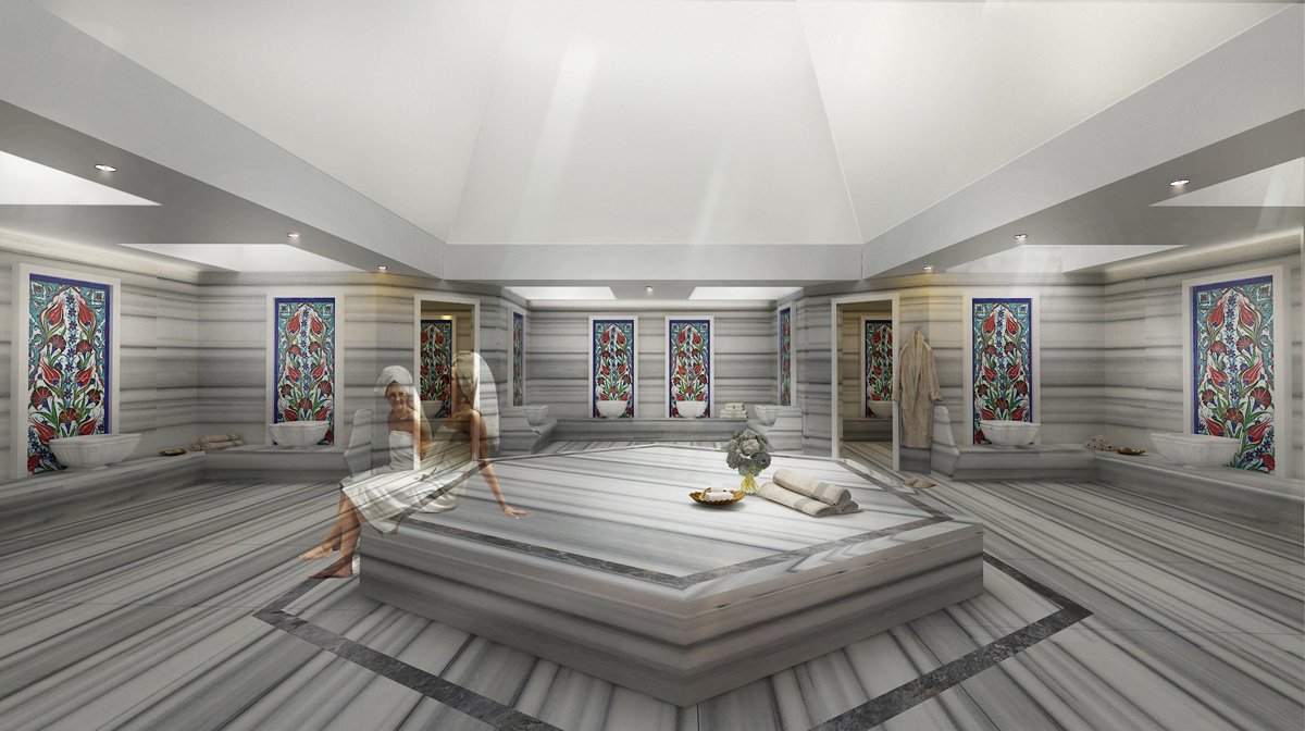 Hamam gün ışığı çatı fenerleri ile aydınlatılacak. Hamamın yanı sıra havuz ve masaj odaları da yer alacak.