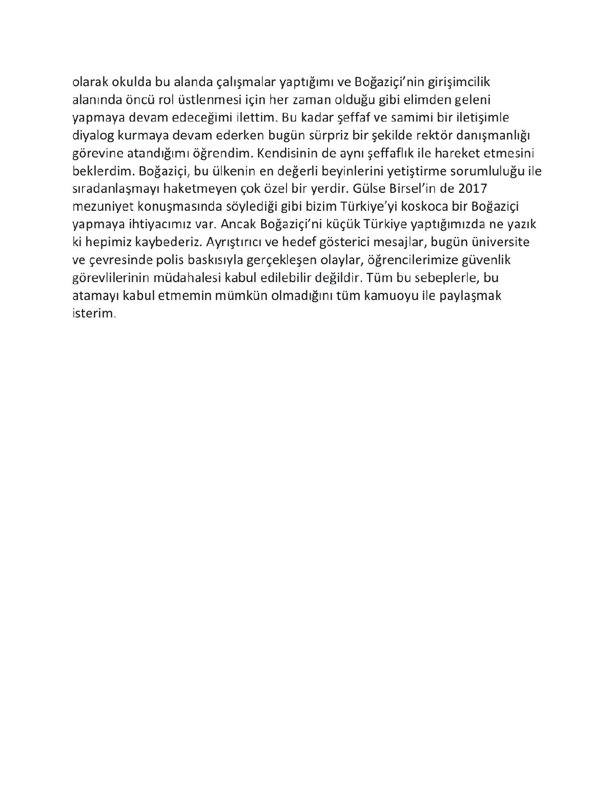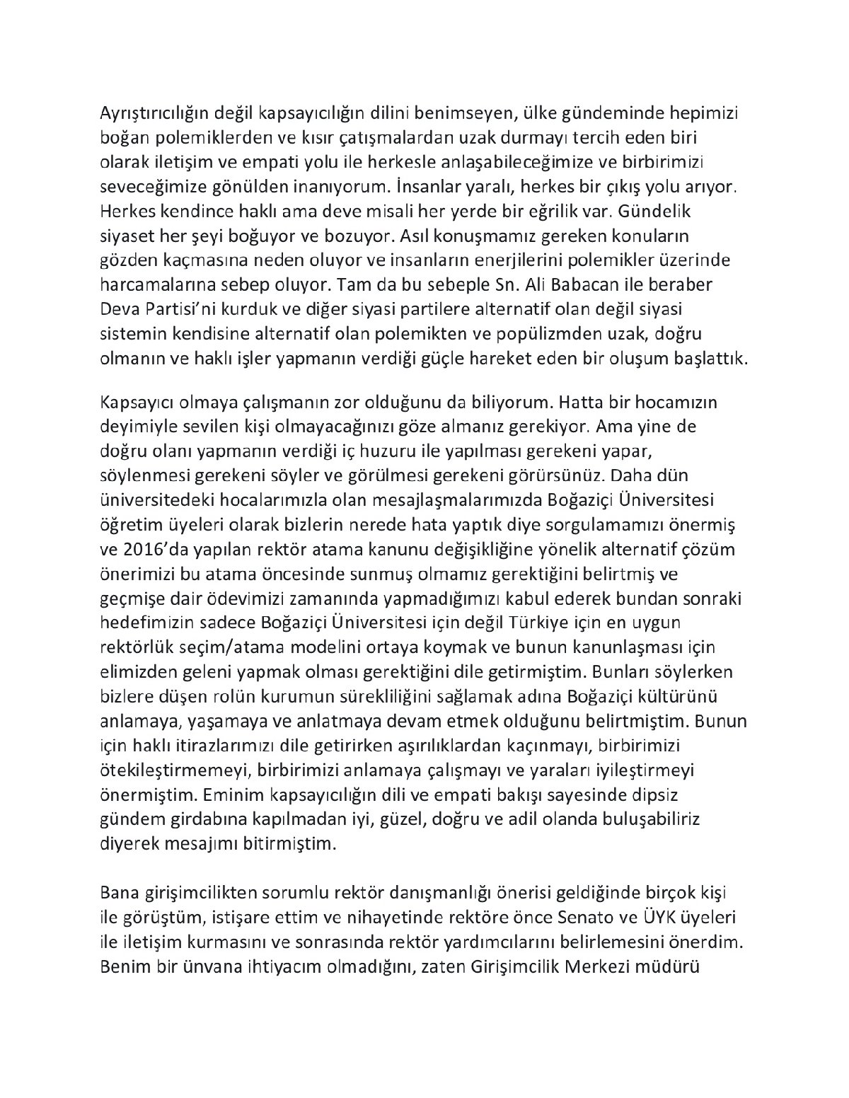 Twitter hesabından paylaştığı açıklamada ‘sürpriz bir şekilde atandığını öğrendiğini’ belirten DEVA Partisi Kurucu Üyesi Oğuzhan Aygören, “Bu atamayı kabul etmemin mümkün olmadığını tüm kamuoyu ile paylaşmak isterim” ifadelerini kullandı.Aygören,”Bizim Türkiye’yi koskoca bir Boğazçi yapmaya ihtiyacımız var. Ancak Boğaziçi’ni küçük Türkiye yaptığımızda ne yazık ki hepimiz kaybederiz. Ayrıştırıcı ve hedef gösterici mesajlar, bu gün üniversite ve çevresinde polis baskısı ile gerçekleşen olaylar, öğrencilerimize güvenlik görevlilerinin müdahalesi kabul edilebilir değildir. Tüm bu sebeplerle bu atamayı kabul etmemin mümkün olmadığını tüm kamuoyu ile paylaşmak isterim” dedi.DEVA Partisi Genel Başkan Yardımcısı İdris Şahin, Aygören’in görevi kabul etmesi halinde parti ile yollarının ayrılacağını duyurmuştu.Aygören’in açıklaması şöyle: