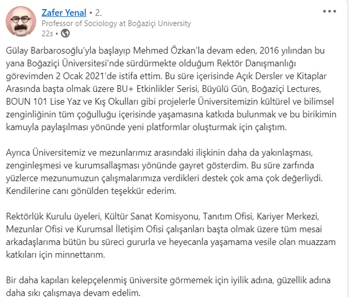 Boğaziçi Üniversitesi'nde sosyoloji bölümünde öğretim üyesi olan aynı zamanda rektör danışmanlığı görevini yürüten Prof. Dr. Zafer Yenal, istifa haberini LinkedIn hesabından duyurdu. Yenal açıklamasında şu ifadeleri kullandı;*Gülay Barbarosoğlu'yla başlayıp Mehmed Özkan'la devam eden, 2016 yılından bu yana Boğaziçi Üniversitesi’nde sürdürmekte olduğum Rektör Danışmanlığı görevimden 2 Ocak 2021’de istifa ettim.*Bu süre içerisinde Açık Dersler ve Kitaplar Arasında başta olmak üzere BU+ Etkinlikler Serisi, Büyülü Gün, Boğaziçi Lectures, BOUN 101 Lise Yaz ve Kış Okulları gibi projelerle Üniversitemizin kültürel ve bilimsel zenginliğinin tüm çoğulluğu içerisinde yaşamasına katkıda bulunmak ve bu birikimin kamuyla paylaşılması yönünde yeni platformlar oluşturmak için çalıştım.*Ayrıca Üniversitemiz ve mezunlarımız arasındaki ilişkinin daha da yakınlaşması, zenginleşmesi ve kurumsallaşması yönünde gayret gösterdim. Bu süre zarfında yüzlerce mezunumuzun çalışmalarımıza verdikleri destek çok ama çok değerliydi. Kendilerine canı gönülden teşekkür ederim.*Rektörlük Kurulu üyeleri, Kültür Sanat Komisyonu, Tanıtım Ofisi, Kariyer Merkezi, Mezunlar Ofisi ve Kurumsal İletişim Ofisi çalışanları başta olmak üzere tüm mesai arkadaşlarıma bütün bu süreci gururla ve heyecanla yaşamama vesile olan muazzam katkıları için minnettarım.*Bir daha kapıları kelepçelenmiş üniversite görmemek için iyilik adına, güzellik adına daha sıkı çalışmaya devam edelim.