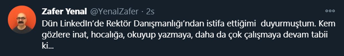 TWİTTER’DAN DA AÇIKLAMA YAPTIProf. Yenal, Twitter hesabından yaptığı paylaşımda da “Dün LinkedIn'de Rektör Danışmanlığı'ndan istifa ettiğimi duyurmuştum. Kem gözlere inat, hocalığa, okuyup yazmaya, daha da çok çalışmaya devam tabii ki…” ifadelerini kullandı.