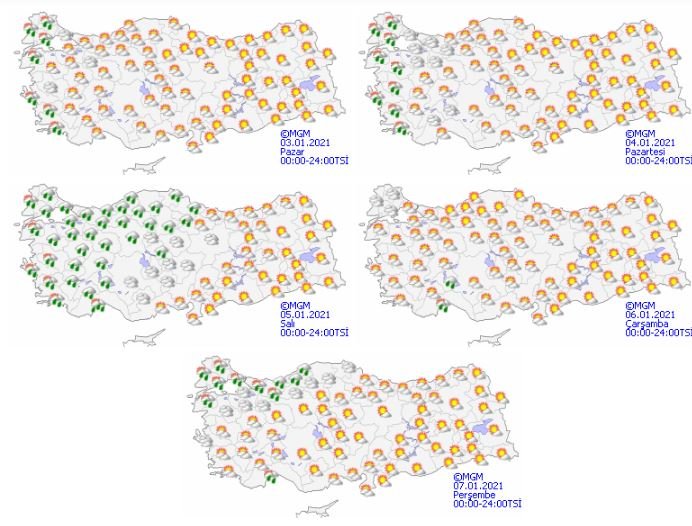 KISA SÜRELİ SAĞANAKLAR GÖRÜLECEKMeteoroloji Genel Müdürlüğü tarafından yapılan son değerlendirmelere göre; Ülkemizin batısının parçalı yer yer çok bulutlu, Kıyı Ege ile Edirne, Kırklareli, Tekirdağ ve Çanakkale çevrelerinin yağmur ve sağanak yağışlı, diğer yerlerin az bulutlu ve açık geçeceği tahmin ediliyor. Sabah ve gece saatlerinde ülkemizin doğusunda buzlanma ve don olayı ile birlikte iç ve doğu bölgelerde yer yer pus ve sis hadisesi bekleniyor.11 OCAK’TAN SONRA SOĞUKLAR BAŞLIYORSıcak geçen günler ocak ayının ortaları yaklaşırken geride kalacak. Küresel tahmin sistemlerine göre 11 Ocak’tan itibaren düşüşe geçen sıcaklıklar ocak ayının ortalarından itibaren mevsim normallerine dönecek.İlginizi Çekebilir