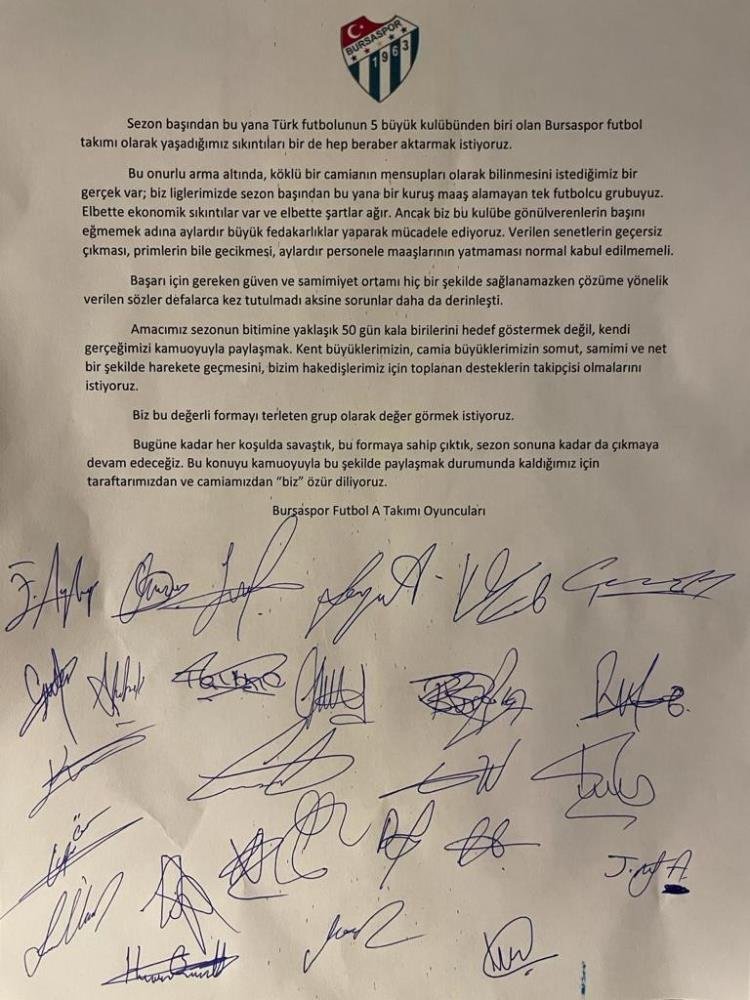 Süper Lig'de şampiyonluk yaşamış 6 kulüpten biri olan Bursaspor'da futbolcular isyan bayrağını açarak sezon başından bu yana para alamadıklarını imzaladıkları ortak bir bildiriyle duyurdu. TFF 1. Lig ekiplerinden Bursaspor Kulübü'nün A takım futbolcuları kulüpteki maddi imkansızlıklara karşı ‘artık yeter’ dedi! Sezon başında bu yana maaşlarının yatmamasından şikayet eden yeşil-beyazlı futbolcular, Ankaraspor galibiyeti sonrası kamuoyu ile bir belge paylaştı.Belgede yazan ifadeler şu şekilde: “Sezon başından bu yana Türk futbolunun 5 büyük kulübünden biri olan Bursaspor futbol takımı olarak yaşadığımız sıkıntıları bir de hep beraber aktarmak istiyoruz. Bu onurlu arma altında, köklü bir camianın mensupları olarak bilinmesini istediğimiz bir gerçek var; biz liglerimizde sezon başından bu yana bir kuruş maaş alamayan tek futbolcu grubuyuz. Elbette ekonomik sıkıntılar var ve elbette şartlar ağır. Ancak biz bu kulübe gönül verenlerin başını eğmemek adına aylardır büyük fedakarlıklar yaparak mücadele ediyoruz. Verilen senetlerin geçersiz çıkması, primlerin bile gecikmesi, aylardır personele maaşlarının yatmaması normal kabul edilmemeli. Başarı için gereken güven ve samimiyet ortamı hiç bir şekilde sağlanamazken çözüme yönelik verilen sözler defalarca kez tutulmalı aksine sorunlar daha da derinleşti. Amacımız sezonun bitimine yaklaşık 50 gün kala birilerini hedef göstermek değil, kendi gerçeğimizi kamuoyuyla paylaşmak. Kent büyüklerimizin, camia büyüklerimizin somut, samimi ve net bir şekilde harekete geçmesini, bizim hak edişlerimiz için toplanan desteklerin takipçisi olmalarını istiyoruz. Biz bu değerli formayı terleten grup olarak değer görmek istiyoruz. Bugüne kadar her koşulda savaştık, bu formaya sahip çıktık, sezon sonuna kadar da çıkmaya devam edeceğiz. Bu konuyu kamuoyuyla bu şekilde paylaşmak durumunda kaldığımız için taraftarımızdan ve camiamızdan “biz” özür diliyoruz.”