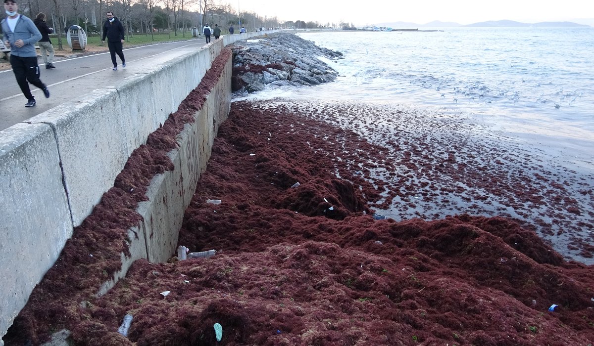 Kadıköy Caddebostan sahilinde havanın aydınlanmasıyla beraber sahile vuran kırmızı yosunlar ve çöpler göze çarptı. Sahilin ve kayalıkların adeta kırmızı renge bürünmesine sebep olan yosunlar görenlerin ilgisini çekti.