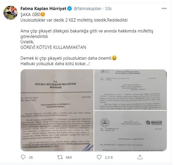 MÜFETTİŞ GÖNDERİLDİSuç duyurusunun ardından Kocaeli Valiliği şikayeti yerinde görerek İzmit Belediye Başkanı Fatma Kaplan Hürriyet hakkında inceleme ve soruşturma başlattı. İzmit Belediyesi’ne AKP’li Kocaeli Büyükşehir Belediyesi tarafından müfettiş gönderildi.YOLSUZLUKTAN DAHA ÖNEMLİ!CHP’li İzmit Belediye Başkanı Fatma Kaplan Hürriyet sosyal medya hesabından soruşturma ile karşı karşıya olduğunu duyurarak, “Şaka gibi, usulsüzlükler var dedik. 2 kez müfettiş istedik, reddedildi. Ama çöp şikayet dilekçesi bakanlığa gitti ve anında hakkımda müfettiş görevlendirildi. Üstelik, görevi kötüye kullanmaktan. Demek ki çöp şikayeti yolsuzluktan daha önemli. Halbuki yolsuzluk daha kötü kokar…!” ifadelerini kullandı.