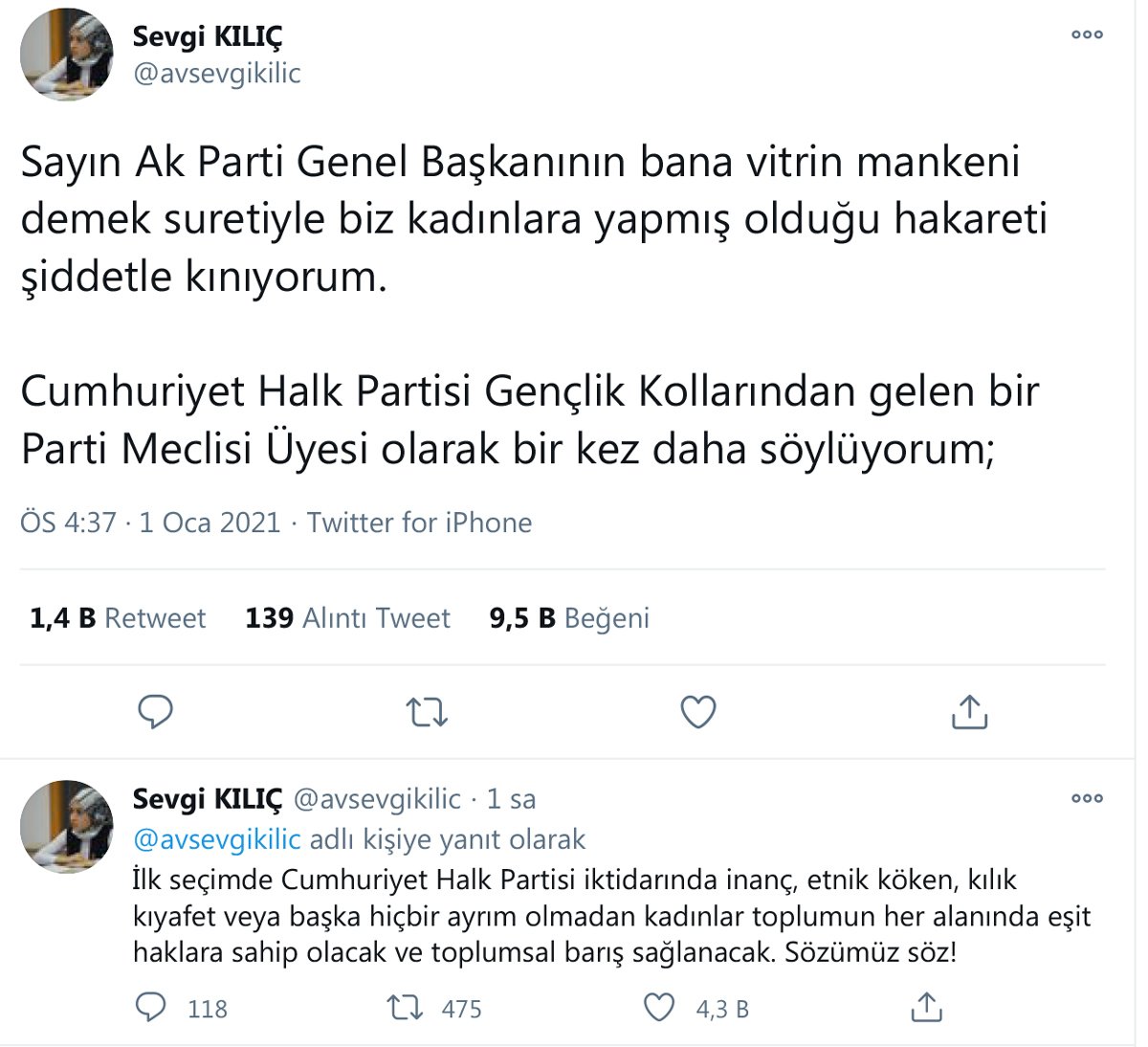 Cumhurbaşkanı ve AKP Genel Başkanı Erdoğan, Ayasofya Cami çıkışında CHP’ye Fikri Sağlar’ın açıklamaları üzerinden yüklenirken “Oy almak için bazı yerlerde görüyorsunuz, başörtülü birkaç kişiyi de yanlarında adeta böyle vitrin mankeni gibi getirip koymak kimseyi artık aldatmıyor. Geçti o işler” dedi.“CHP İKTİDARINDA TOPLUMSAL BARIŞ SAĞLANACAK, SÖZ”Erdoğan'ın ‘vitrin mankeni' ifadesi ise sosyal medyada tepkilere neden oldu. O tepkilerden birini ise sözlerin hedefinde yer alan CHP Parti Meclisi Üyesi Sevgi Kılıç gösterdi.Twitter hesabından paylaşımda bulunan Kılıç, şu açıklamada bulundu:* Sayın Ak Parti Genel Başkanının bana vitrin mankeni demek suretiyle biz kadınlara yapmış olduğu hakareti şiddetle kınıyorum.* Cumhuriyet Halk Partisi Gençlik Kollarından gelen bir Parti Meclisi Üyesi olarak bir kez daha söylüyorum; ilk seçimde Cumhuriyet Halk Partisi iktidarında inanç, etnik köken, kılık kıyafet veya başka hiçbir ayrım olmadan kadınlar toplumun her alanında eşit haklara sahip olacak ve toplumsal barış sağlanacak. Sözümüz söz!KILIÇ, KILIÇDAROĞLU'NUN SAĞLAR HAKKINDAKİ AÇIKLAMALARINA DESTEK VERMİŞTİKılıç, CHP Genel Başkanı Kemal Kılıçdaroğlu'nun, Fikri Sağlar'ın türbanla ilgili açıklamalarına sert tepki göstererek “Böyle bir ayrımcılığı asla kabul etmiyor ve doğru bulmuyorum. Çağın neresindeyiz biz? Kişi baş örtüsü takar takmaz. Bu onun tercihidir” açıklamasına da sosyal medyadan destek vermişti.“Cumhuriyetimizin 2. yüzyılında kadınların veya erkeklerin kılık kıyafeti üzerinden siyaset yapması kabul edilemez” diyen Kılıç, şu ifadeleri kullanmıştı:* Genel Başkanımız Sayın Kemal Kılıçdaroğlu'nun da açıkça defalarca ifade ettiği üzere biz 83 milyon vatandaşımızla bayrağımızın altında huzur içerisinde yaşamak istiyoruz.* Etnik kimlik, yaşam tarzı, cinsiyet veya inanç üzerinden siyaset yapılmasının ve toplumun kategorize edilmesinin tam karşısındayız.* Ülkemizdeki temel sorunlardan biri yargının vesayet altında olmasıdır! Sarayın dediğini yaparak anayasa karşı gelen ve hukukun üstünlüğünü hiçe yargı mensuplarıdır.“CHP, KADINLARIN KATEGORİZE EDİLMEDEN VAR OLMASININ TEMİNATIDIR”Kılıç, açıklamasının devamında şöyle demişti:* İlk seçimde Cumhuriyet Halk Partisi iktidarında yargı vesayetine son verilecek, hakimler ve savcılar dayı ya da iktidar torpiliyle değil liyakatleriyle görev yapacaklar.* Cumhuriyet Halk Partisi sadece yargı alanında değil kadınların her alanda hiçbir şekilde kategorize edilmeden var olmasının teminatıdır.* Genel Başkanımızın da söylediği gibi ‘Kişi başörtüsü takar takmaz; bu onun tercihidir. Benim görevim, onun tercihine saygı duymaktır. Hakim hukukun üstünlüğü ve vicdani kanaatine göre karar verirse gerçek anlamda hakimdir; benim başımın üstünde yeri vardır’.