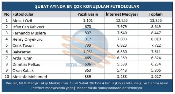 Mesut Özil Almanya'da gündem oldu... Fenerbahçe-Göztepe maçı öncesi...Ocak ayının ardından Şubat ayında da en fazla konuşulan futbolcu olan Mesut Özil, Türk medyasında 13 bin 356 habere adını yazdırarak listenin ilk sırasında yer aldı. İkinci basamakta ise Fenerbahçe'nin orta saha oyuncusu İrfan Can Kahveci 8 bin 649 haber ile yer alırken, listenin üçüncü sırasında ise 8 bin 447 haber ile Galatasaray'ın kalecisi Muslera yer aldı.