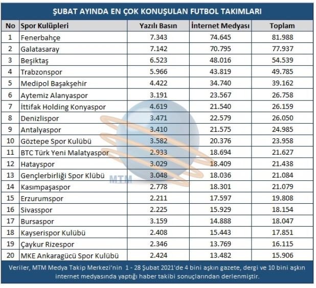 Şubat ayının en çok konuşulan takımları, futbolcuları, kulüp yöneticileri, teknik direktörleri ve hakemleri belli oldu. Medya Takip Merkezi’nin (MTM), Türkiye Spor Yazarları Derneği için hazırladığı rapora göre; ay boyunca spor medyasının gündeminde en çok yer alan konular: Fenerbahçe – Galatasaray derbisi, Mesut Özil’in İstiklal Marşı’na eşlik etmesi ve Galatasaray’ın çalıştırıcısı Fatih Terim oldu. İşte araştırmanın detayları… Şubat ayının en çok konuşulan takımları, futbolcuları, kulüp yöneticileri, teknik direktörleri ve hakemleri belli oldu. Medya Takip Merkezi'nin (MTM), Türkiye Spor Yazarları Derneği için hazırladığı rapora göre; ay boyunca spor medyasının gündeminde en çok yer alan konular: Fenerbahçe – Galatasaray derbisi, Mesut Özil'in İstiklal Marşı'na eşlik etmesi ve Galatasaray'ın çalıştırıcısı Fatih Terim oldu. İşte araştırmanın detayları…Süper Lig'in 24. Haftasında oynanan Fenerbahçe – Galatasaray derbisinin yankıları Şubat ayı spor gündemine damga vurdu. Şampiyonluk mücadelesi veren iki ezeli rakip, Kadıköy’de karşı karşıya geldi.Koronavirüs önlemleri kapsamında seyircisiz oynanan zorlu mücadelede Galatasaray, yeni transferi Mısırlı oyuncu Mostafa Mohammed’in golüyle sahadan 1-0 galip ayrılarak Fenerbahçe’nin 9 maçlık yenilgisizlik serisini sona erdirdi. Galatasaray, ligde geçen sezon 3-1’lik skorla 20 yılı aşkın süre sonra deplasmanda yendiği rakibini Kadıköy’de bu sezon da mağlup etmeyi başardı.