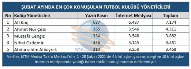 Süper Lig'in 25. haftasında Fatih Karagümrük'e konuk olan Fenerbahçe 2-1 galip gelirken, Başkan Ali Koç maç sonunda basın mensuplarına açıklamalarda bulundu. Fenerbahçe Başkanı Koç, Galatasaraylı mevkidaşı Mustafa Cengiz’in hafta içinde yaptığı açıklamalara karşı, Karagümrük maçı sonrasında “Zamanı gelince belgelerle konuşacağız” ifadelerini kullandı. Sözlerine; “Mustafa Cengiz'in açıklamalarına cevap vermeyeceğim; bu insanların, koskoca adamların yalanları, iftiraları… Bir haftadır neredeyse her gün konuşup, kulübümüzü hedef almaları… Bununla uğraşamayız. Müthiş bir algı operasyonu yapıyorlar. Canları sağ olsun. Zannetmesinler cevap vermeyeceğiz. Zamanı gelince ilgili arkadaşlar belgelerle konuşacak” şeklinde devam etti.Geride bıraktığımız Şubat ayında toplam 7 bin 174 habere konu olan Fenerbahçe Başkanı Ali Koç en fazla konuşulan yönetici sıralamasında birinci sırada yer alırken, Ahmet Nur Çebi ise 4 bin 311 haber ile ikinci, Mustafa Cengiz ise 3 bin 882 haberle üçüncü sıraya adını yazdırdı.