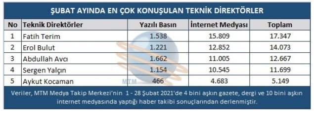 Sezonun ilk devresinde yönetime “Transfer şart” mesajı veren Fatih Terim, Mostafa, Onyekuru, Yedlin ve Gedson'un alınmasında gösterdiği kararlılığın meyvesini ilk maçlarda topladı. Ligde üst üste galibiyetler alarak şampiyonluğun en önemli favorisi haline gelen Galatasaray’da ‘transfer’ mutluluğu yaşandı. Teknik Direktör Fatih Terim, sezonun ilk devresinde eksik bölgelere dikkat çekip yönetime transfer yapılmasının şart olduğunu iletmişti. Bu sürecin ardından devre arası transfer döneminde Henry Onyekuru geri döndü. Mostafa Mohamed, DeAndre Yedlin ve Gedson Fernandes kadroya katıldı. Terim, scout ekibiyle birlikte kadroya kattığı bu isimlerden kısa sürede büyük katkı aldı. Mostafa 4, Onyekuru 2 ve Gedson da Alanyaspor’la oynanan kupa maçında 1 kez fileleri havalandırdı.Daha önce pek çok kez “en çok konuşulan antrenör” olma unvanını kimseye kaptırmayan Fatih Terim, ay boyunca toplam 17 bin 347 haberde yer alarak Şubat ayının da lideri oldu. Terim'i ikinci sırada 14 bin 73 haber ile Erol Bulut, üçüncü sırada ise 12 bin 667 haber ile Trabzonspor'u şampiyonluk potasına sokan Abdullah Avcı izledi.