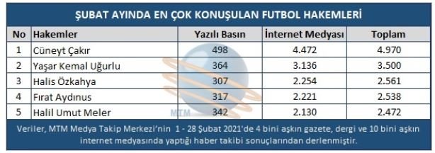 FIFA kokartlı hakem Cüneyt Çakır, Portekiz’in Benfica ile İngiltere’nin Arsenal takımları arasında 18 Şubat Perşembe günü oynanan UEFA Avrupa Ligi Son 32 Turu maçını yönetti. Cüneyt Çakır'ın Benfica-Arsenal maçındaki yönetimi ülkenin günlük spor gazetesi Record ve hakem yorumcusu Pedro Henriques tarafından göklere çıkarıldı. Tecrübeli hakemin performansını değerlendiren Portekiz basını Çakır'ın kusursuz bir maç yönettiğini belirtti. Türkiye'yi her defasında başarıyla temsil eden Çakır, 4 bin 970 haber ile Şubat ayında da en çok konuşulan hakem oldu. Listenin ikinci sırasında 3 bin 500 haber ile Yaşar Kemal Uğurlu, üçüncü sırasında ise 2 bin 561 habere adını yazdıran Halis Özkahya yer aldı.