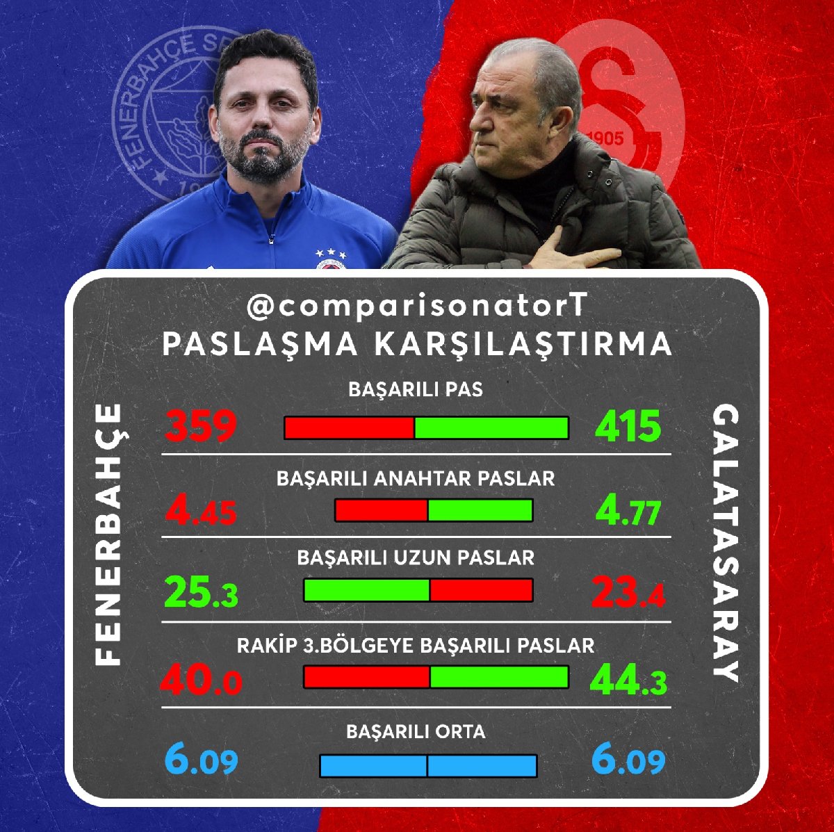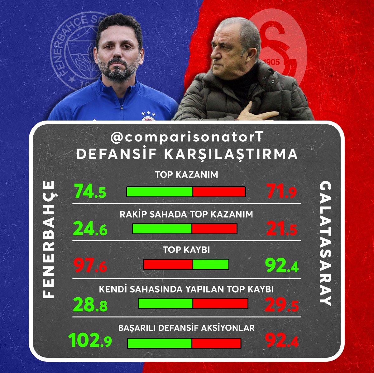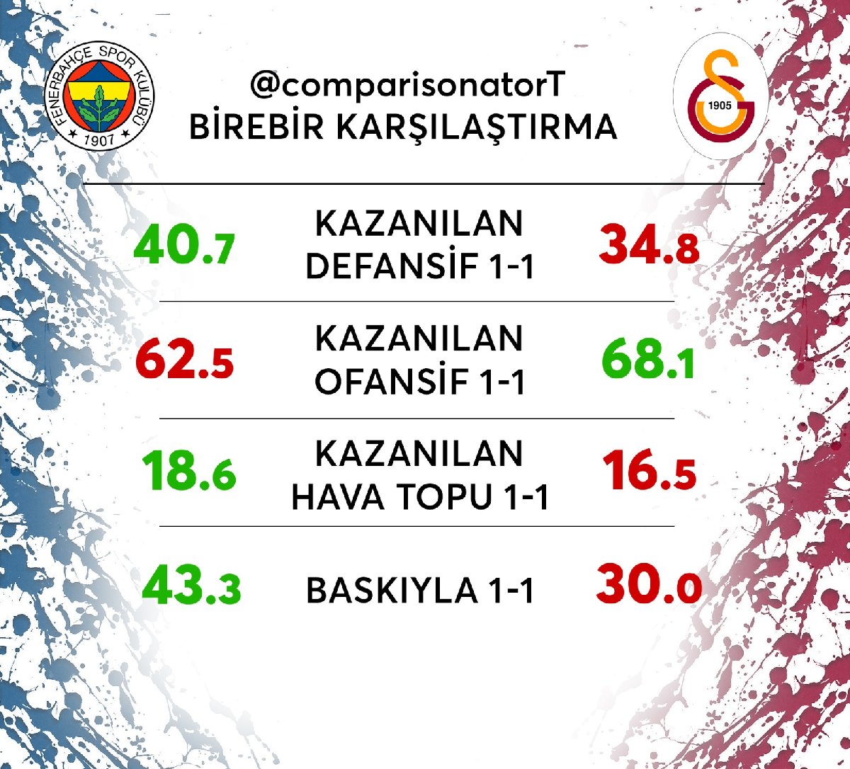 Kazanılan defansif birebirlerde Fenerbahçe önde. Fakat Galatasaray da kazanılan ofansif birebirlerde üstün. Hücumda kazanılan hava topları birebirlerinin ve baskılı oyununsa galibi Fenerbahçe. Baskılı oyunun aslında Türkiye'deki mimarlarından biri Fatih hoca. Fakat Erol hocanın kurduğu baskı ile bugünkü Galatasaray'ın rakamları çok farklı.