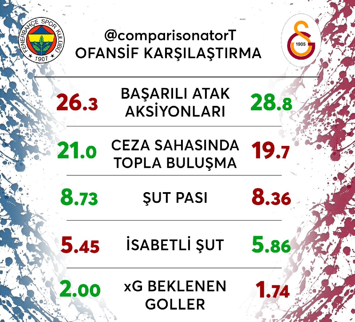 Çok benzerlik taşıyan bir bölüm. Galatasaray çok az farkla genel perspektifte önde gözükse de özellikle hücumdaki hava hakimiyeti Fenerbahçe'den yana. Gol beklentisi de Fenerbahçe'de maç başı “2” ile lig liderliğini almış durumda. Aksiyon çeşitliliğinde de Galatasaray driblinglerde sayısal üstünlükte.
