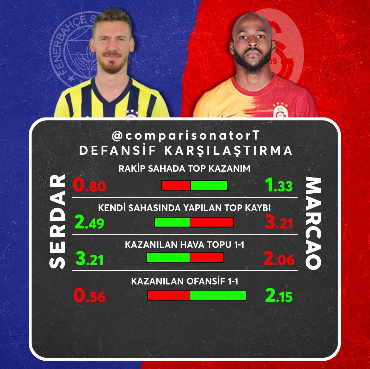 Serdar Aziz'in hava üstünlüğü birebirlerde tartışmasız. Kazanılan defansif birebirlerde yani yerde de defansif olarak Serdar üstün. Fakat Marcao oyunu ileri taşımada, pas dağıtımını 6 numaraya neredeyse eşit ağırlıkta taşıması hücumda onu öne çıkarıyor. Fakat Marcao'nun oyunu öne taşırken arkada bıraktığı boşluğu, özellikle top sol taraftan gelirse tamamlayamayan sağ ve sol bekler mevcut. Burada Fatih hocanın Marcao'ya verdiği rol öne çıkacak.