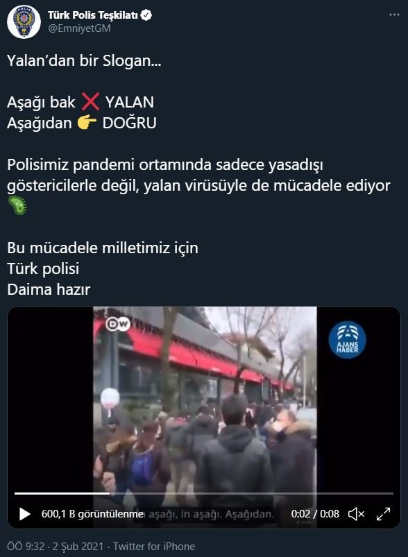 Emniyet Genel Müdürlüğünün Twitter hesabından yapılan videolu paylaşımda polis memurunun, grup içindeki genci “Aşağı bak” diyerek uyardığı iddiasının yalan olduğu, polisin o sırada “Aşağıdan” dediği belirtildi.“Polisimiz pandemi ortamında sadece yasa dışı göstericilerle değil, yalan virüsüyle de mücadele ediyor. Bu mücadele milletimiz için. Türk polisi daima hazır” mesajı ile paylaşılan videoda polisin, “İn aşağı, in aşağı, aşağıdan, aşağıdan. Toplu gitmek yok” diyerek gruptakileri uyarması yer aldı.