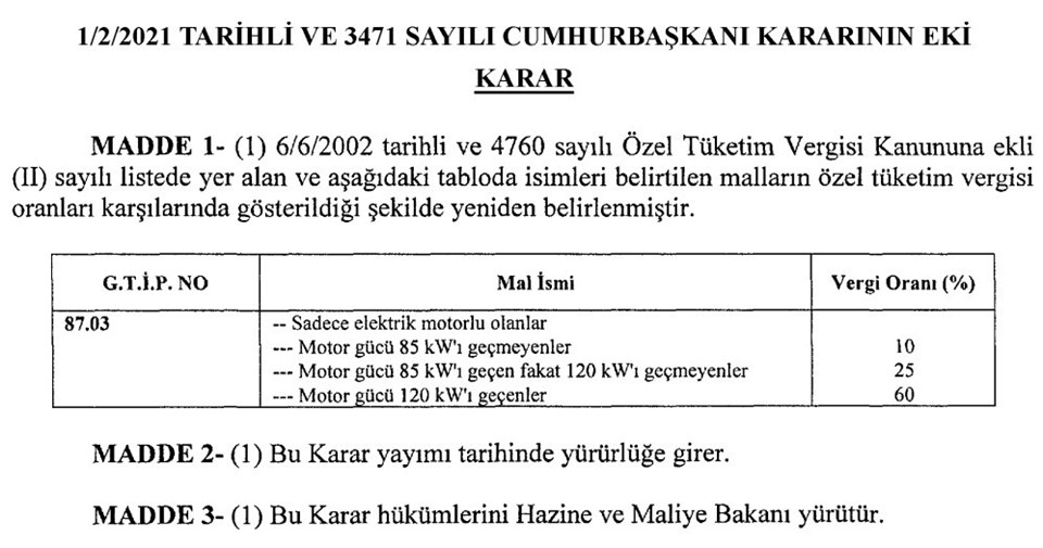 3471 sayılı Cumhurbaşkanı Kararı ile Bazı Malların Özel Tüketim Vergisi (ÖTV) Oranlarının Yeniden Tespiti Hakkında Karar, Resmi Gazete tarafından yayımlanarak yürürlüğe girdi.Kararla, motor gücü 85 kilowatt olan elektrikli araçlarla ÖTV oranı yüzde 3'ten yüzde 10'a, motor gücü 85 kilowatt ile 120 kilowatt arasındaki elektrikli araçlarla ÖTV oranı yüzde 7'den 25'e, motor gücü 120 kilowatı geçen elektrikli araçlarda ise ÖTV oranı yüzde 15'den yüzde 60'a yükseltildi.