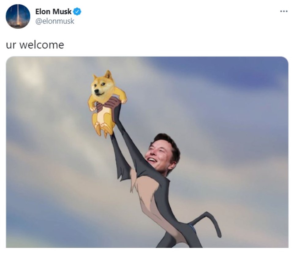 “Ur welcome” (Bir şey değil) başlığıyla bir fotoğraf da paylaşan Musk’un fotoğrafta, kült Aslan Kral filminde maymunun aslanı kaldırdığı sahneye ithafen, Dogecoin’in simgesi olan Shiba Inu köpeğini havaya kaldırdığı görülüyor.